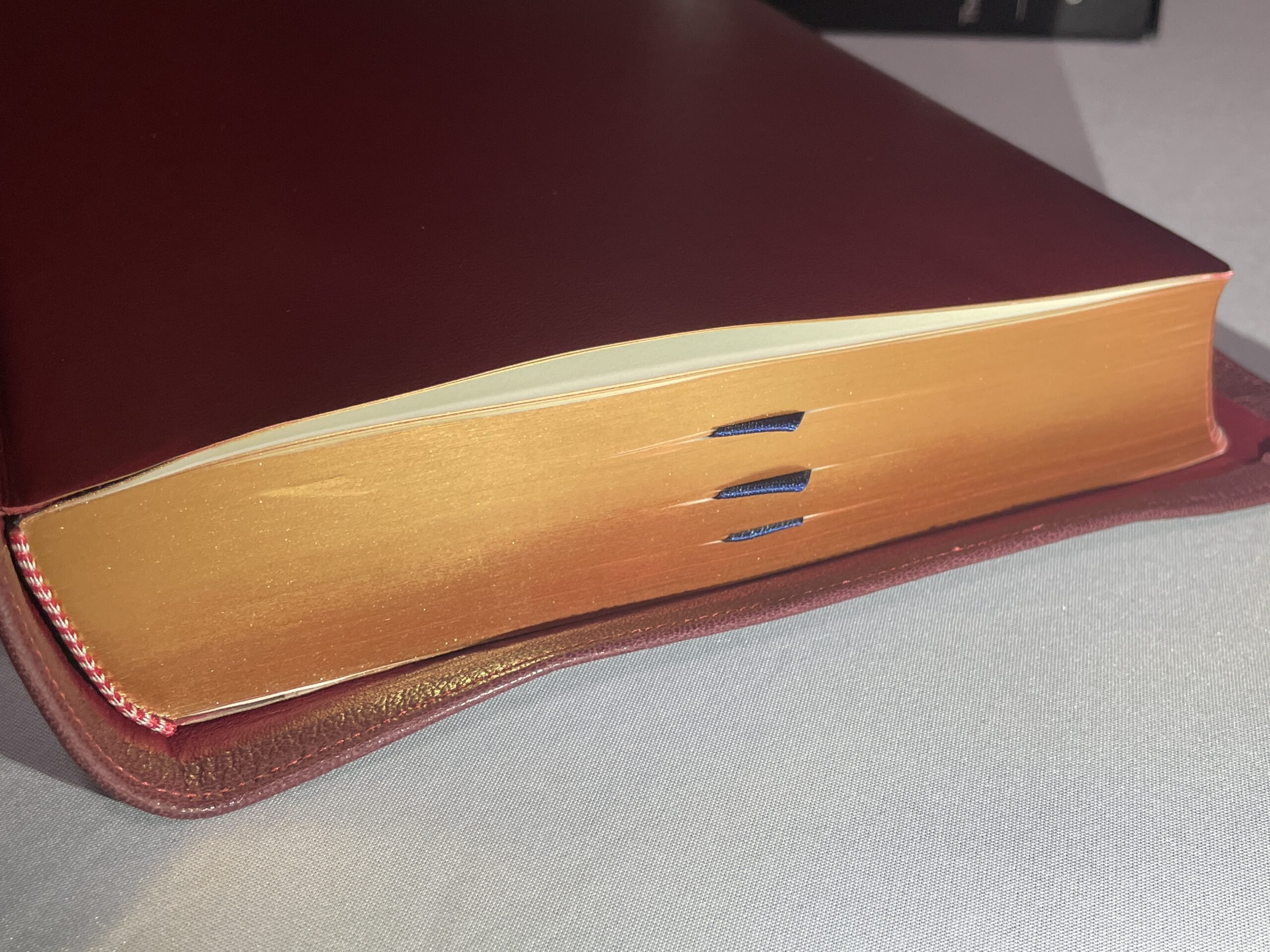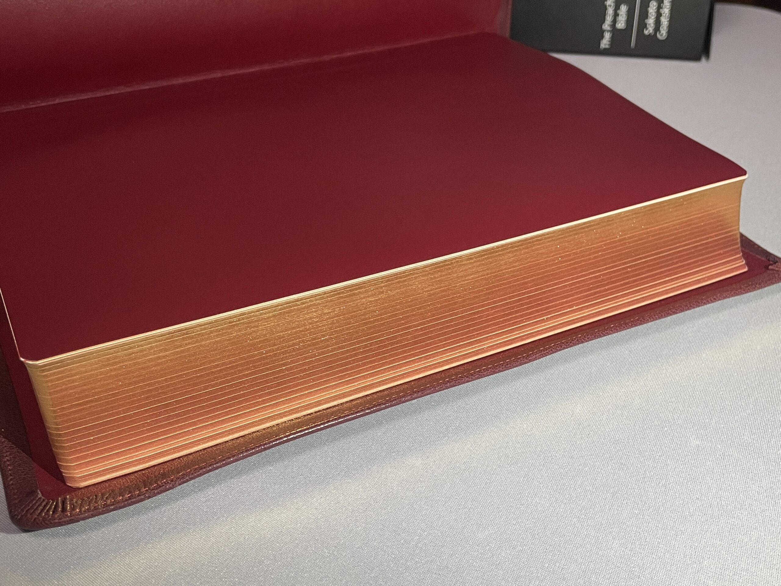 All modern, new Bibles have gilding on the page edges. Generally, this is either a red or blue color under gold or silver. Sometimes, the gold is simply a sprayed-on color also, but usually, it is a thin colored tin foil. This foil is heated and melted onto the book block. The purpose of the Preacher’s Bible is pure quality. With that in mind, we have chosen to go back to the way mid-century Bibles were made – using real gold for the gilding. The Preacher’s Bible comes with 22 karat gold leaf melted onto the edges of the pages. The gilding also helps to protect edges of the pages from damage.