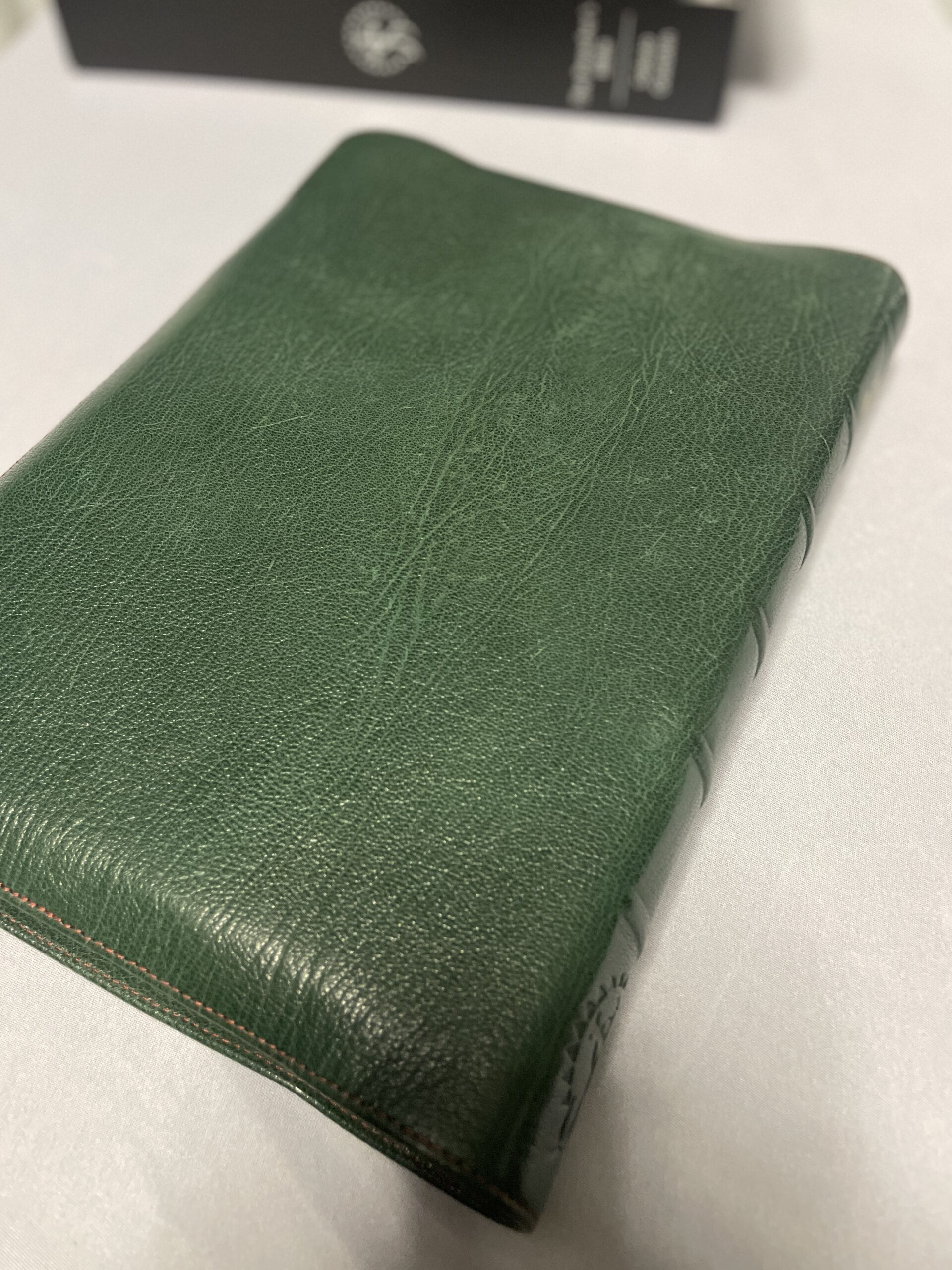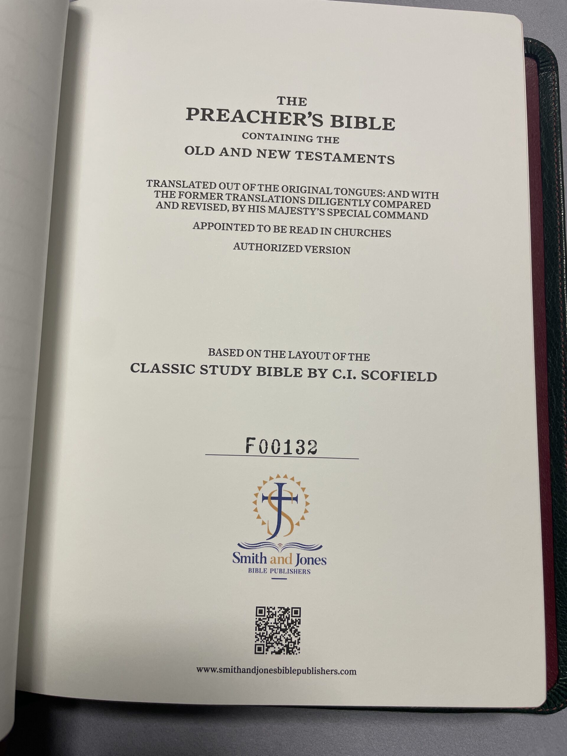 This Forest Green Smith and Jones Preacher’s Bible is the last one to be available. This Bible was in the regular lineup of green Bibles; however, when moving warehouses, it was accidentally placed into a seconds box. There is nothing wrong with this Bible – in fact, it has an interesting characteristic of the natural leather. The specific piece of leather that was used for this cover included the obvious backbone area on the back side of the cover. Very few Bibles have this specific feature, but it has been highly sought after for the few who have actually known about it. If you are wanting a Forest Green Smith and Jones 1st edition PREACHER’s Bible (and a unique one at that!), this auctions is your last chance. We do not plan to produce this 1st Edition in this color again. Any other chance at this color would have to be custom made.