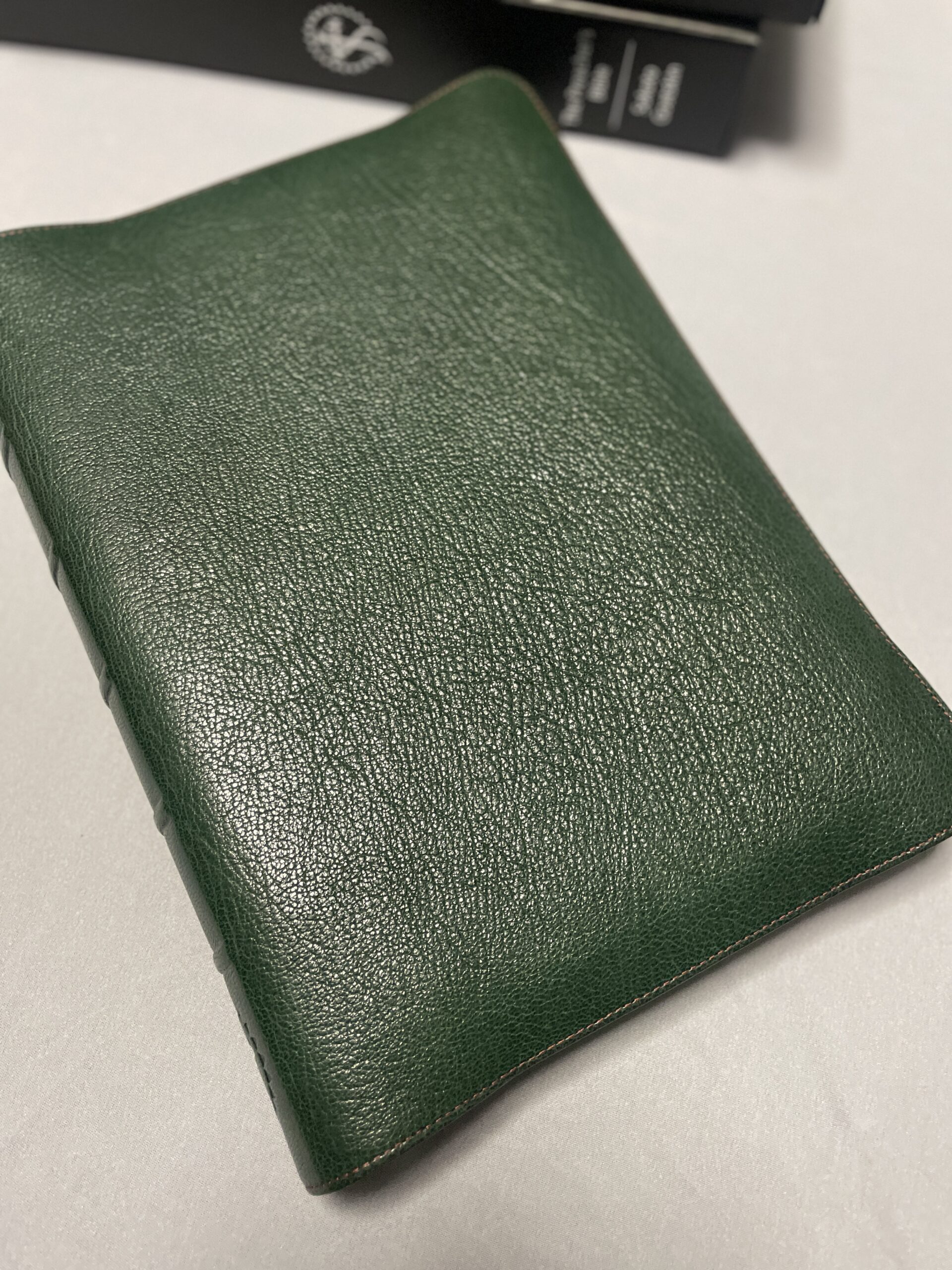 Finally, as mentioned above, this is a genuine top grain goatskin. Many other popular Bibles claim to be calfskin or even goatskin (and they are… kind of). However, what they do to keep costs down is to take the scraps of the calfskin and grind them up; they then compress these pieces together with an adhesive and emboss a grain on the top (similar to OSB boards or plywood).