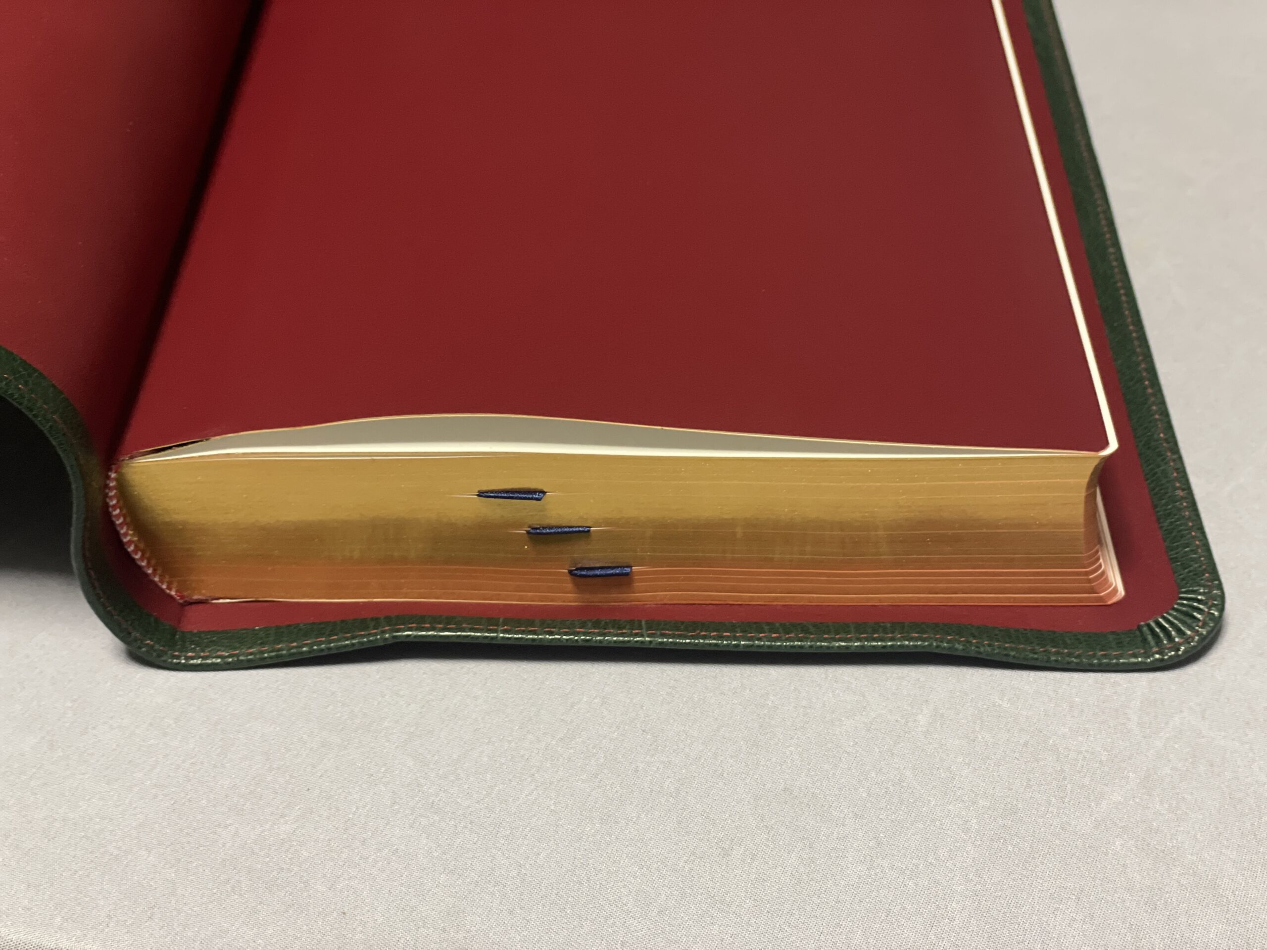 All modern, new Bibles have gilding on the page edges. Generally, this is either a red or blue color under gold or silver. Sometimes, the gold is simply a sprayed-on color also, but usually, it is a thin colored tin foil. This foil is heated and melted onto the book block. The purpose of the Preacher’s Bible is pure quality. With that in mind, we have chosen to go back to the way mid-century Bibles were made – using real gold for the gilding. The Preacher’s Bible comes with 22 karat gold leaf melted onto the edges of the pages. The gilding also helps to protect edges of the pages from damage.