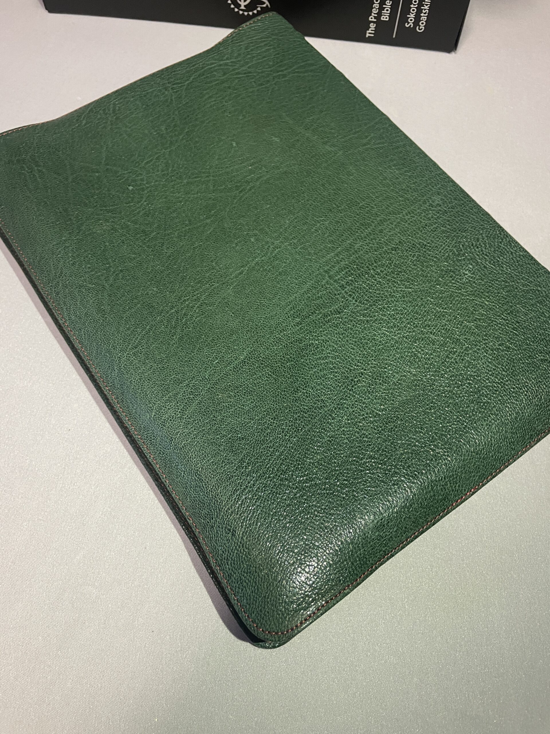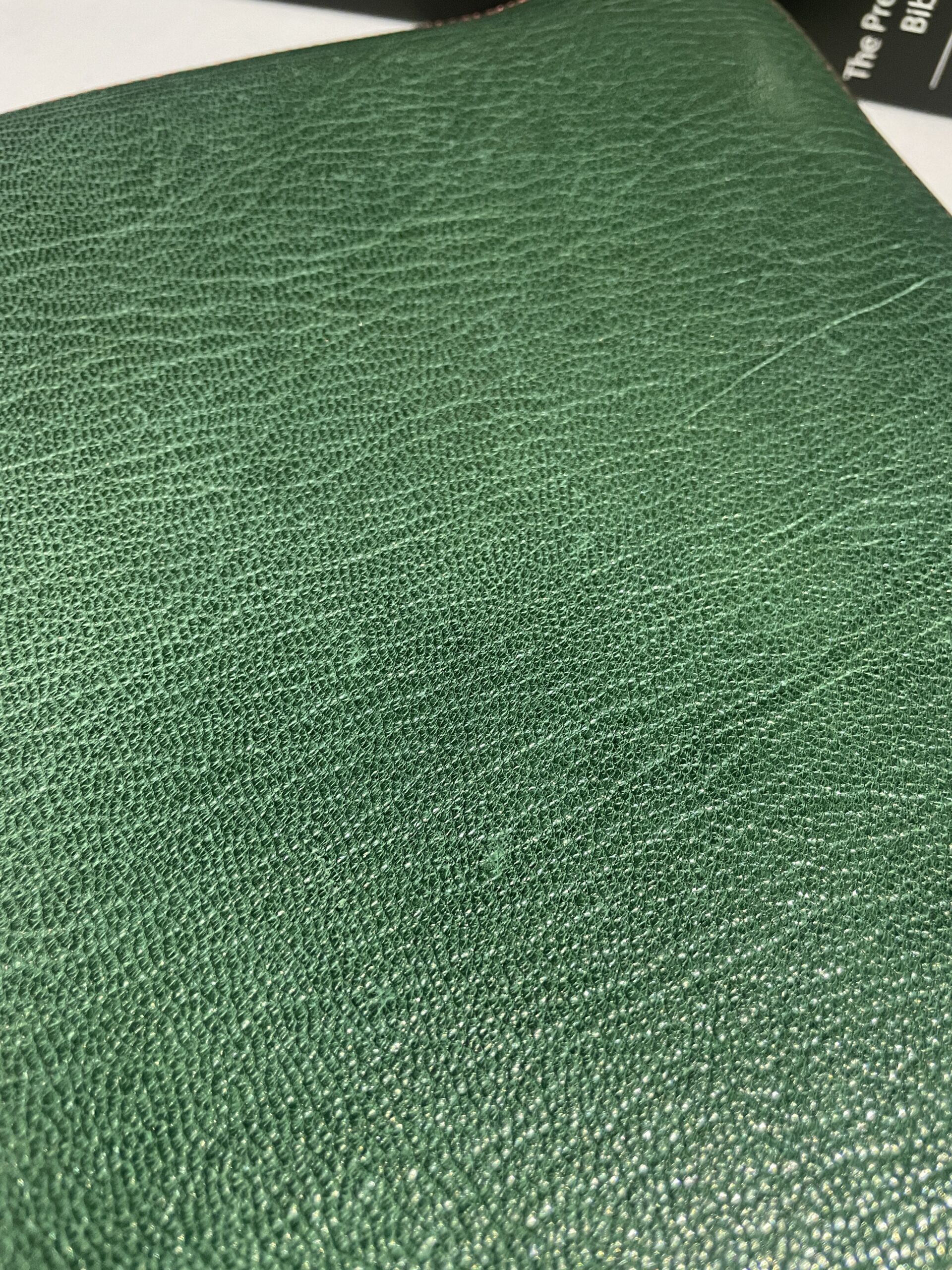 Finally, as mentioned above, this is a genuine top grain goatskin. Many other popular Bibles claim to be calfskin or even goatskin (and they are… kind of). However, what they do to keep costs down is to take the scraps of the calfskin and grind them up; they then compress these pieces together with an adhesive and emboss a grain on the top (similar to OSB boards or plywood).
