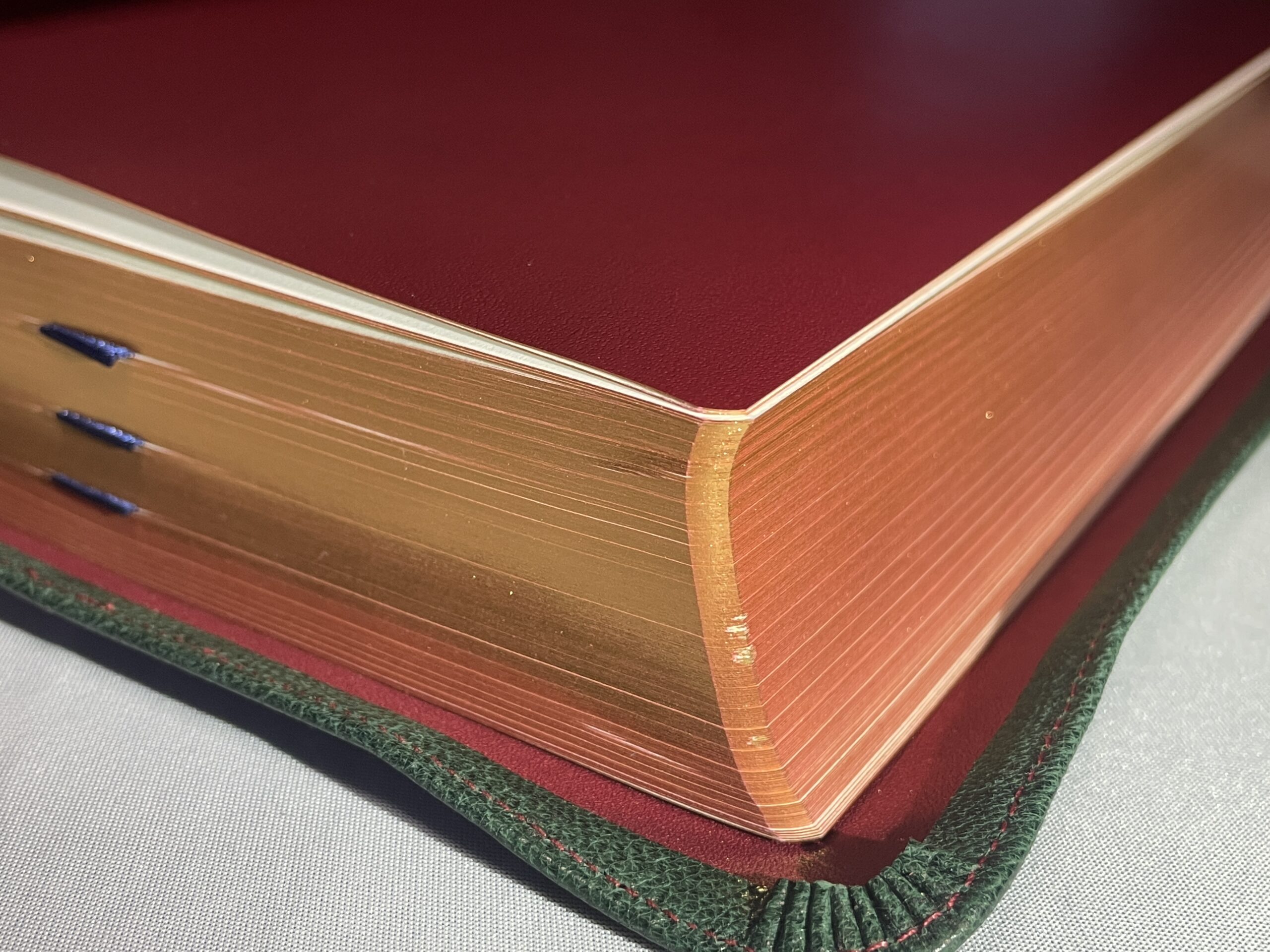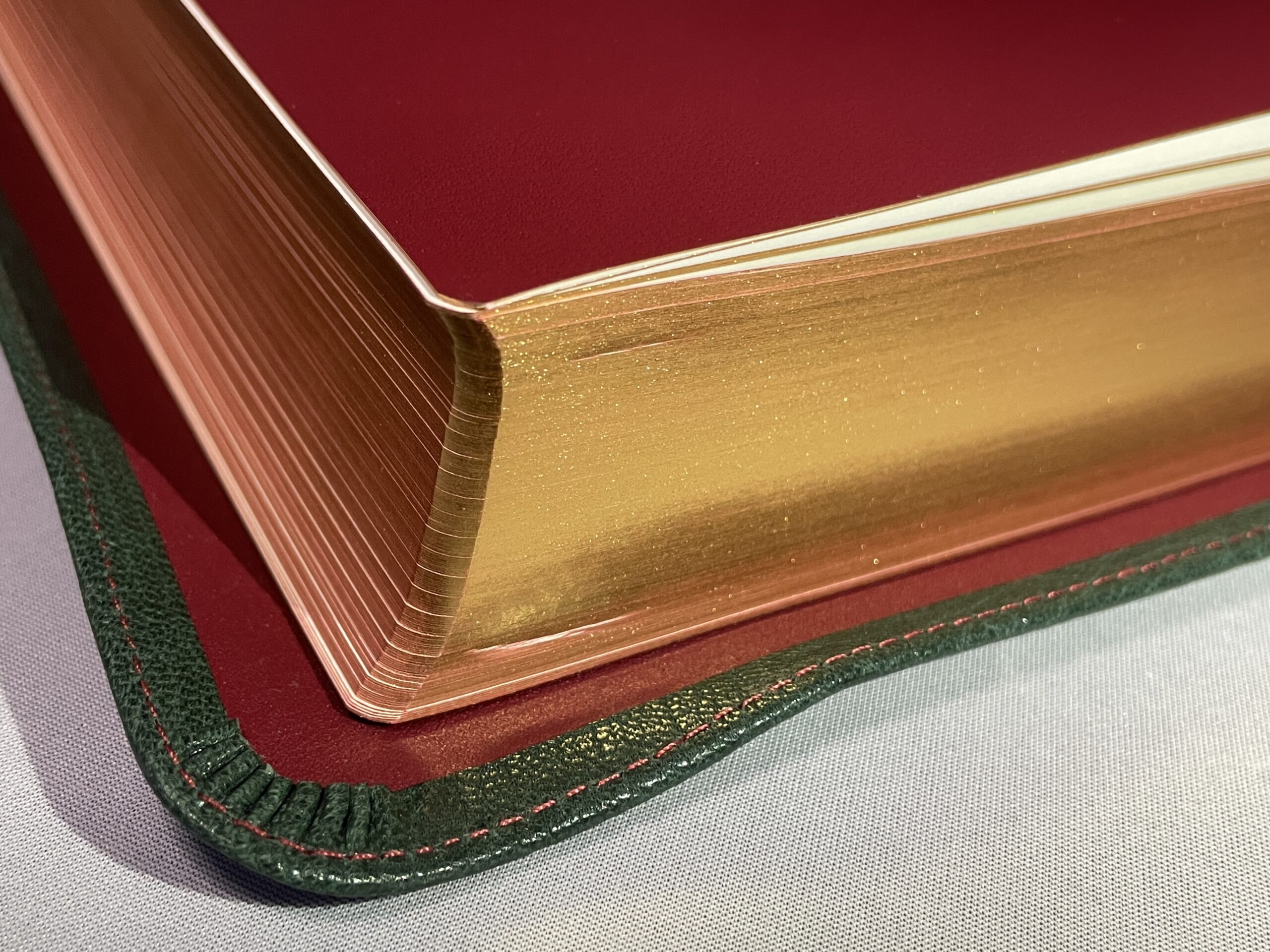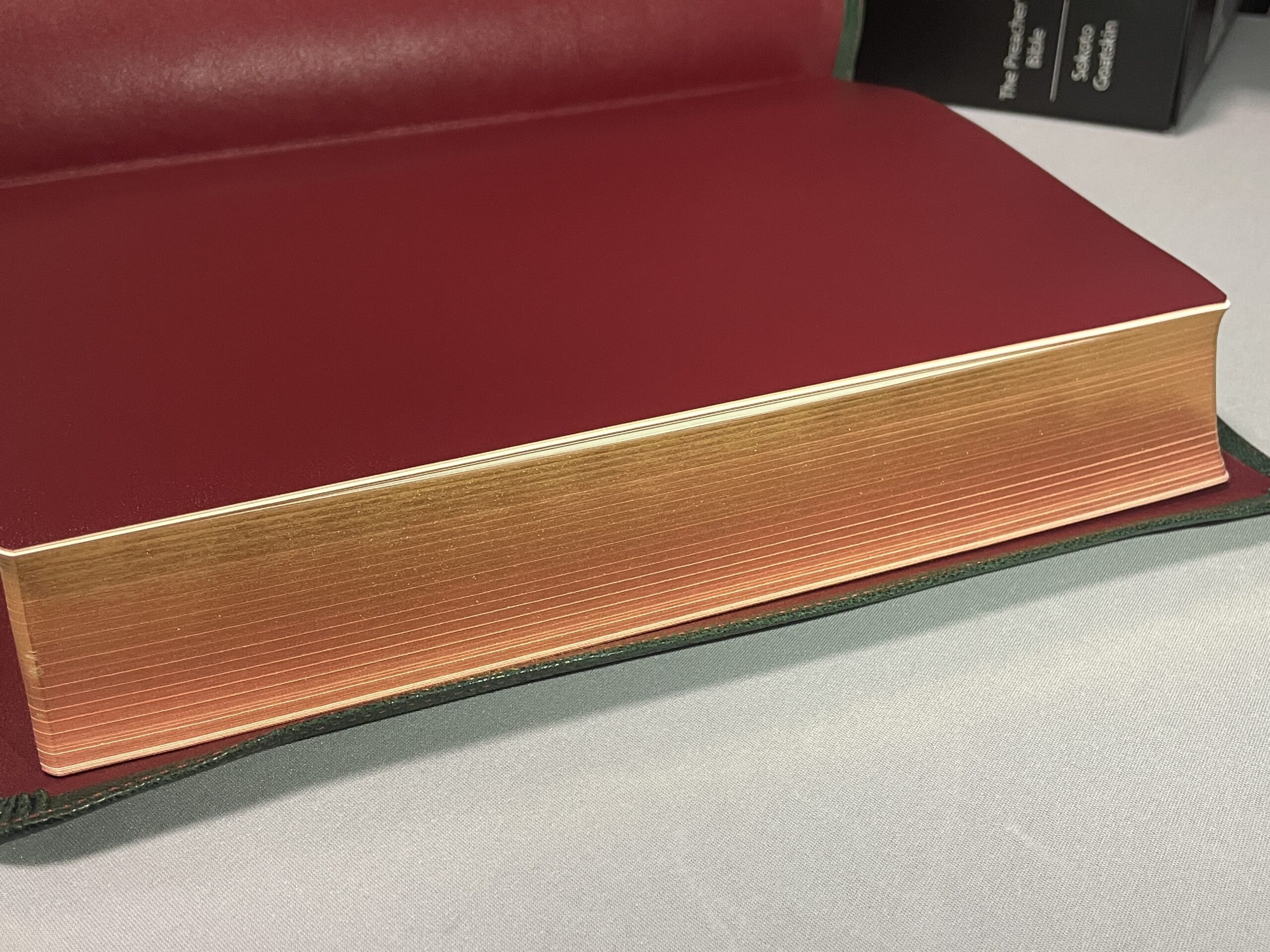 All modern, new Bibles have gilding on the page edges. Generally, this is either a red or blue color under gold or silver. Sometimes, the gold is simply a sprayed-on color also, but usually, it is a thin colored tin foil. This foil is heated and melted onto the book block. The purpose of the Preacher’s Bible is pure quality. With that in mind, we have chosen to go back to the way mid-century Bibles were made – using real gold for the gilding. The Preacher’s Bible comes with 22 karat gold leaf melted onto the edges of the pages. The gilding also helps to protect edges of the pages from damage.