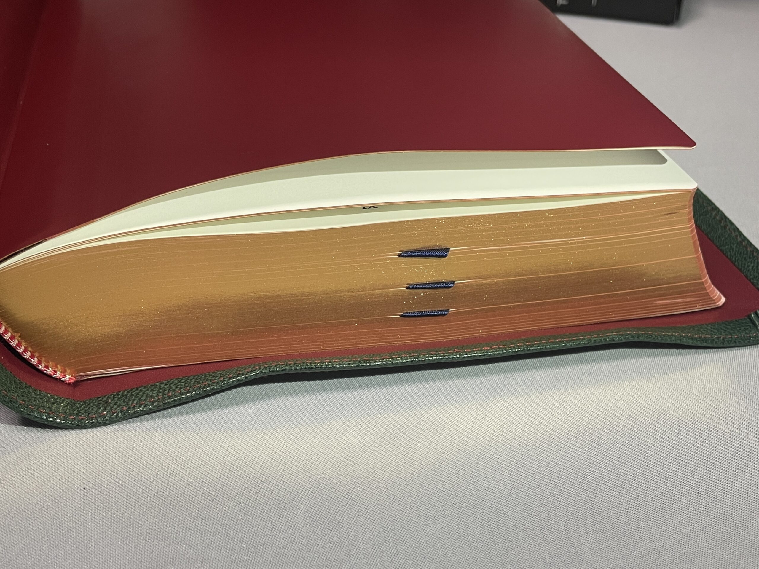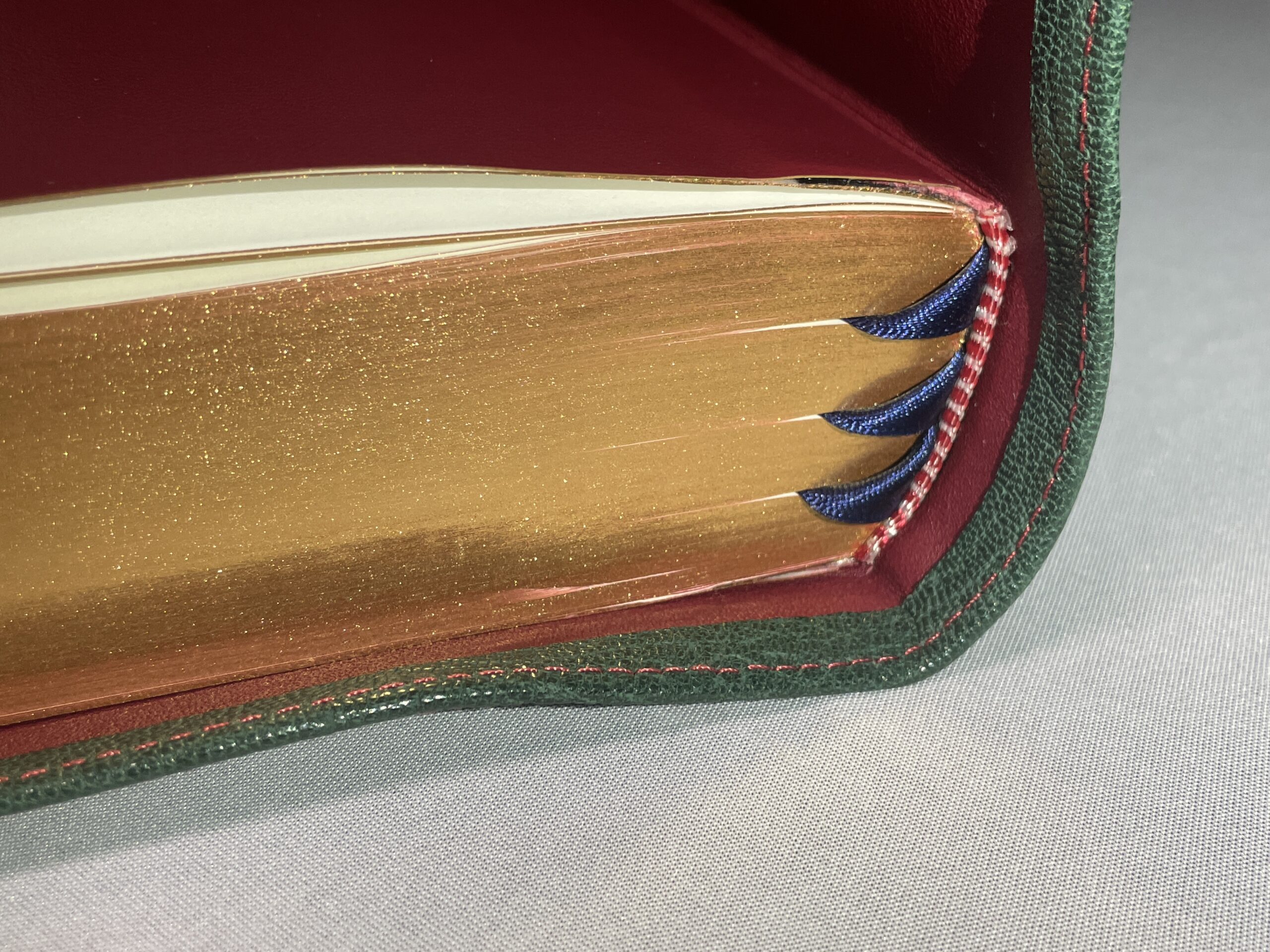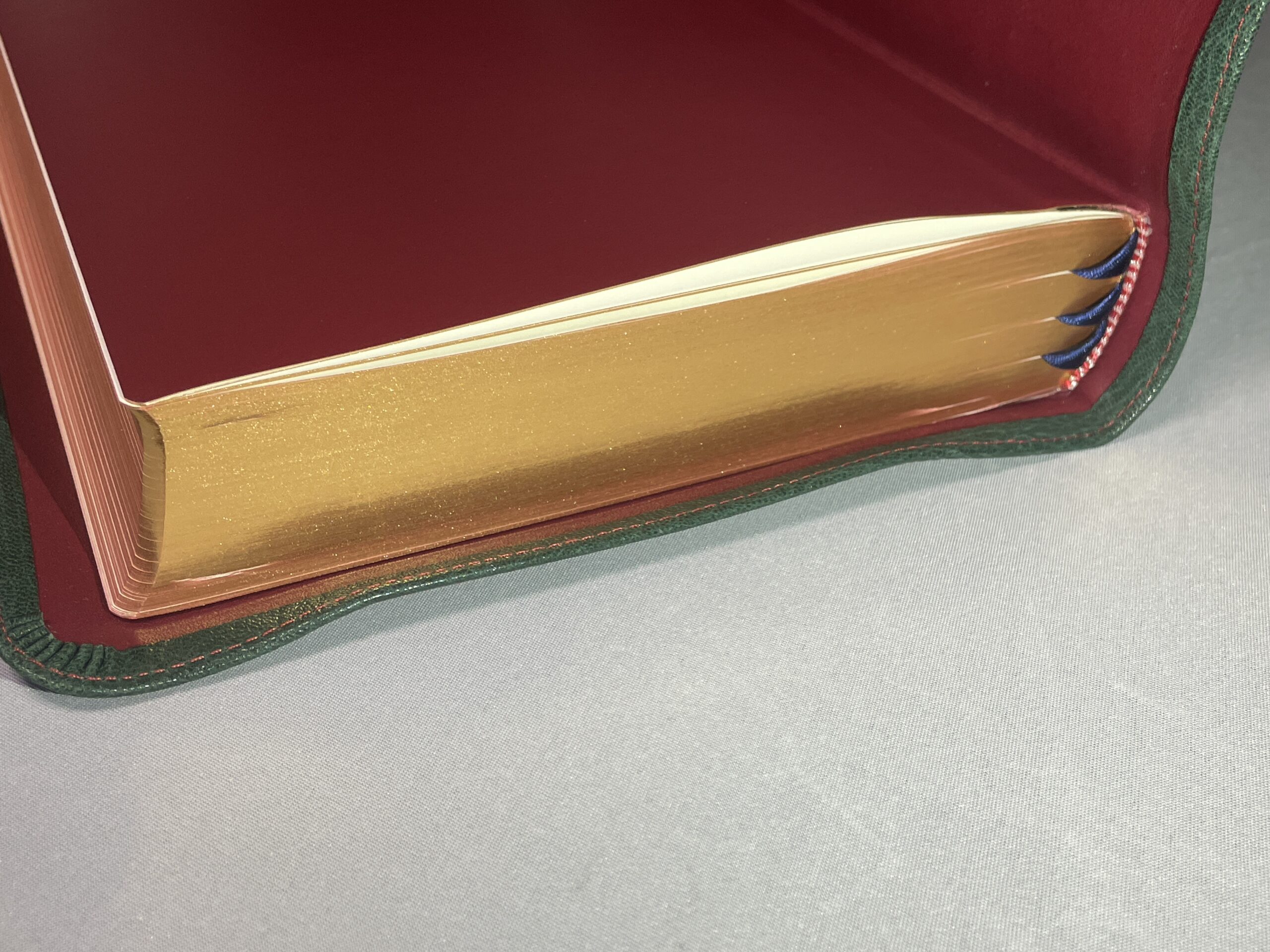 All modern, new Bibles have gilding on the page edges. Generally, this is either a red or blue color under gold or silver. Sometimes, the gold is simply a sprayed-on color also, but usually, it is a thin colored tin foil. This foil is heated and melted onto the book block. The purpose of the Preacher’s Bible is pure quality. With that in mind, we have chosen to go back to the way mid-century Bibles were made – using real gold for the gilding. The Preacher’s Bible comes with 22 karat gold leaf melted onto the edges of the pages. The gilding also helps to protect edges of the pages from damage.