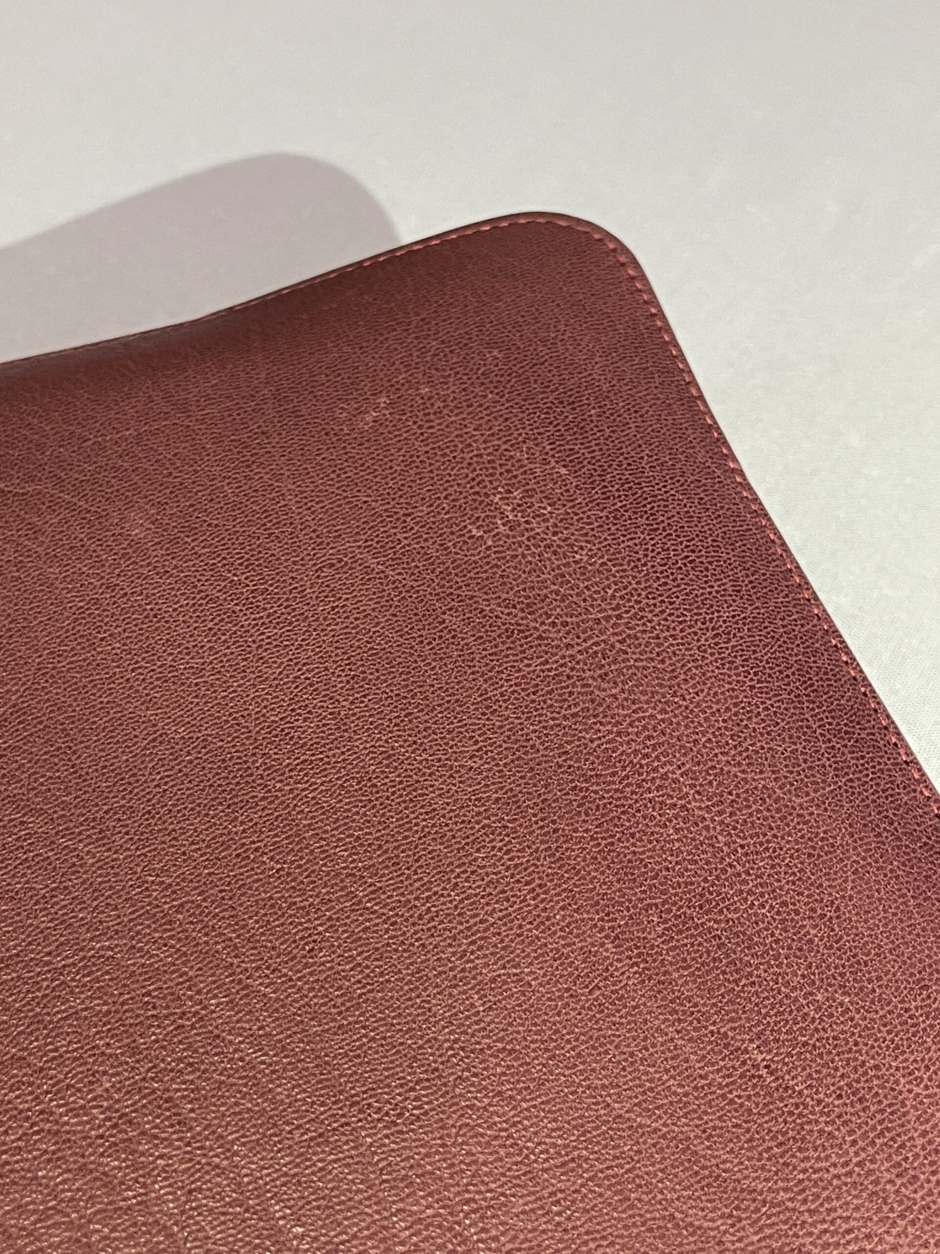 Finally, as mentioned above, this is a genuine top grain goatskin. Many other popular Bibles claim to be calfskin or even goatskin (and they are… kind of). However, what they do to keep costs down is to take the scraps of the calfskin and grind them up; they then compress these pieces together with an adhesive and emboss a grain on the top (similar to OSB boards or plywood).