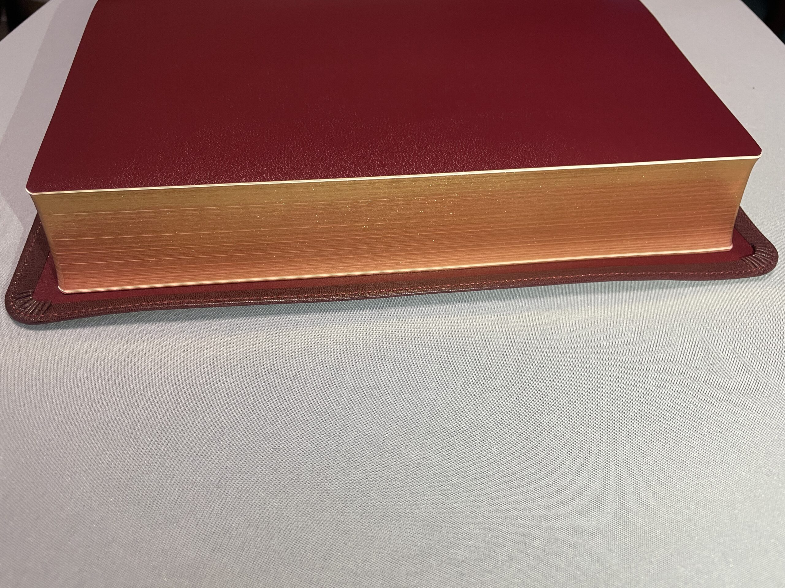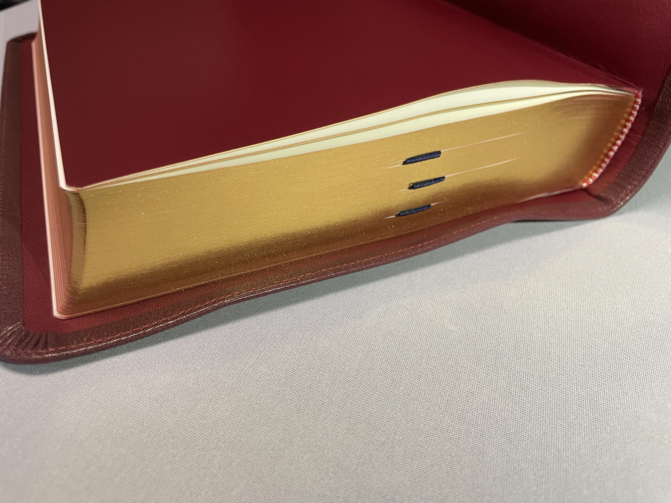 All modern, new Bibles have gilding on the page edges. Generally, this is either a red or blue color under gold or silver. Sometimes, the gold is simply a sprayed-on color also, but usually, it is a thin colored tin foil. This foil is heated and melted onto the book block. The purpose of the Preacher’s Bible is pure quality. With that in mind, we have chosen to go back to the way mid-century Bibles were made – using real gold for the gilding. The Preacher’s Bible comes with 22 karat gold leaf melted onto the edges of the pages. The gilding also helps to protect edges of the pages from damage.