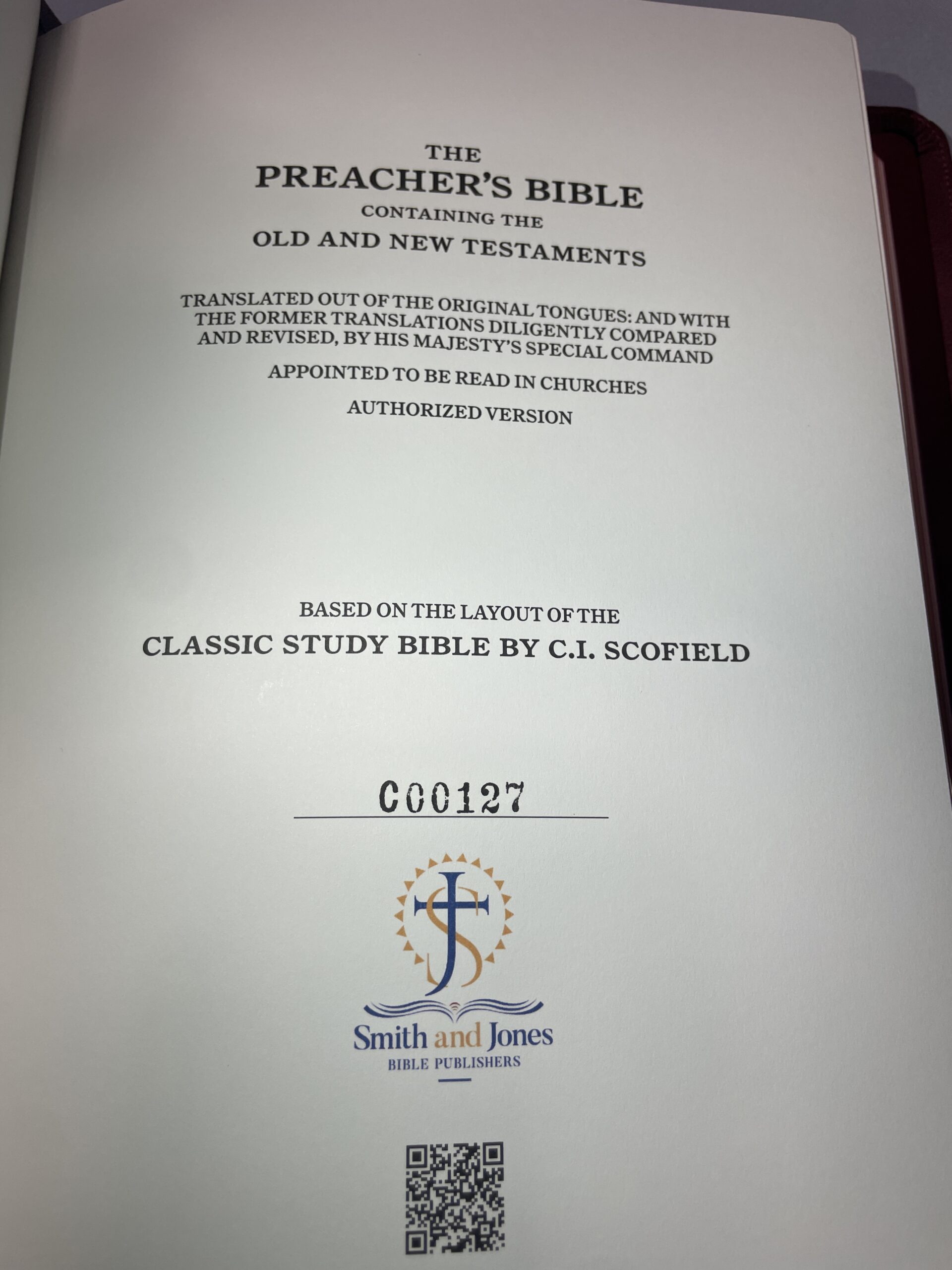 This Crimson Smith and Jones Preacher’s Bible is one of only six left available. These are the same quality Bibles with MINOR cosmetic imperfections. If you are wanting a Crimson Smith and Jones 1st edition PREACHER’s Bible, these auctions are your only chance. We do not plan to produce this 1st Edition in this color again. Any other chance at this color would have to be custom made.