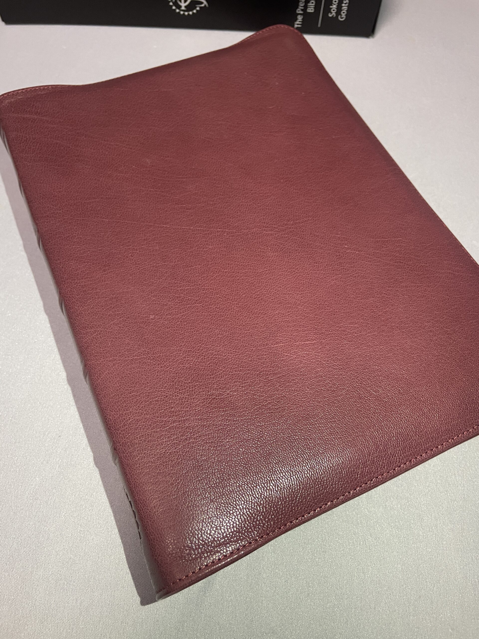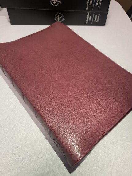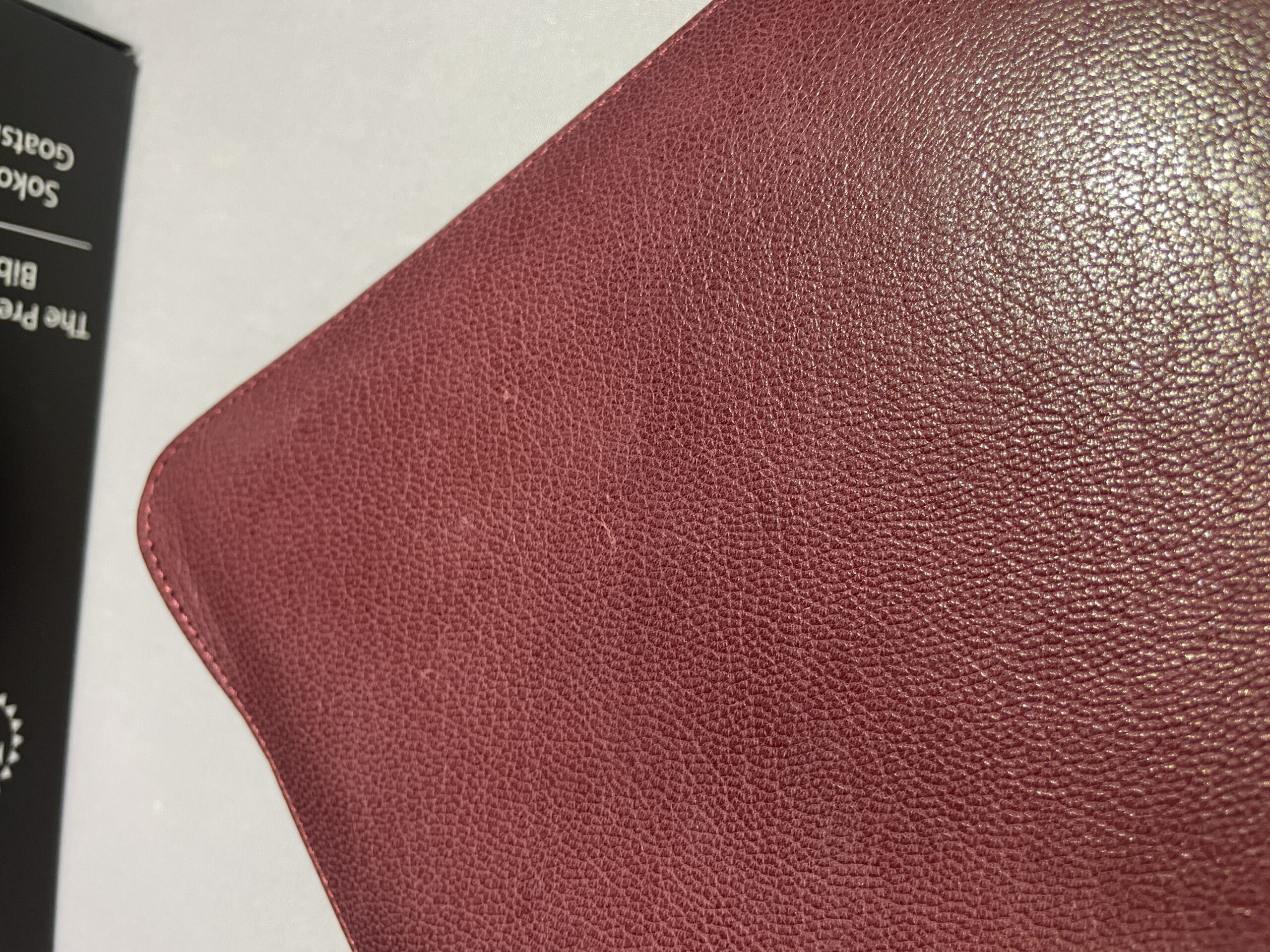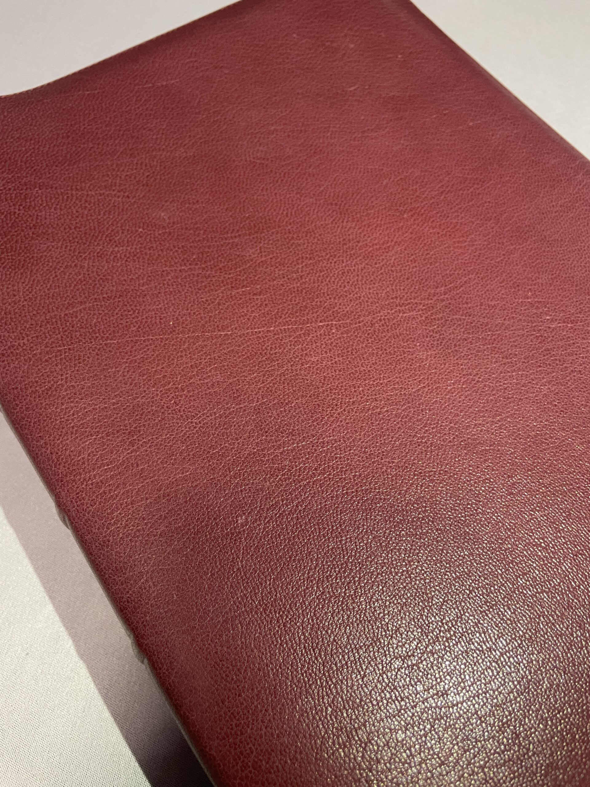 Finally, as mentioned above, this is a genuine top grain goatskin. Many other popular Bibles claim to be calfskin or even goatskin (and they are… kind of). However, what they do to keep costs down is to take the scraps of the calfskin and grind them up; they then compress these pieces together with an adhesive and emboss a grain on the top (similar to OSB boards or plywood).