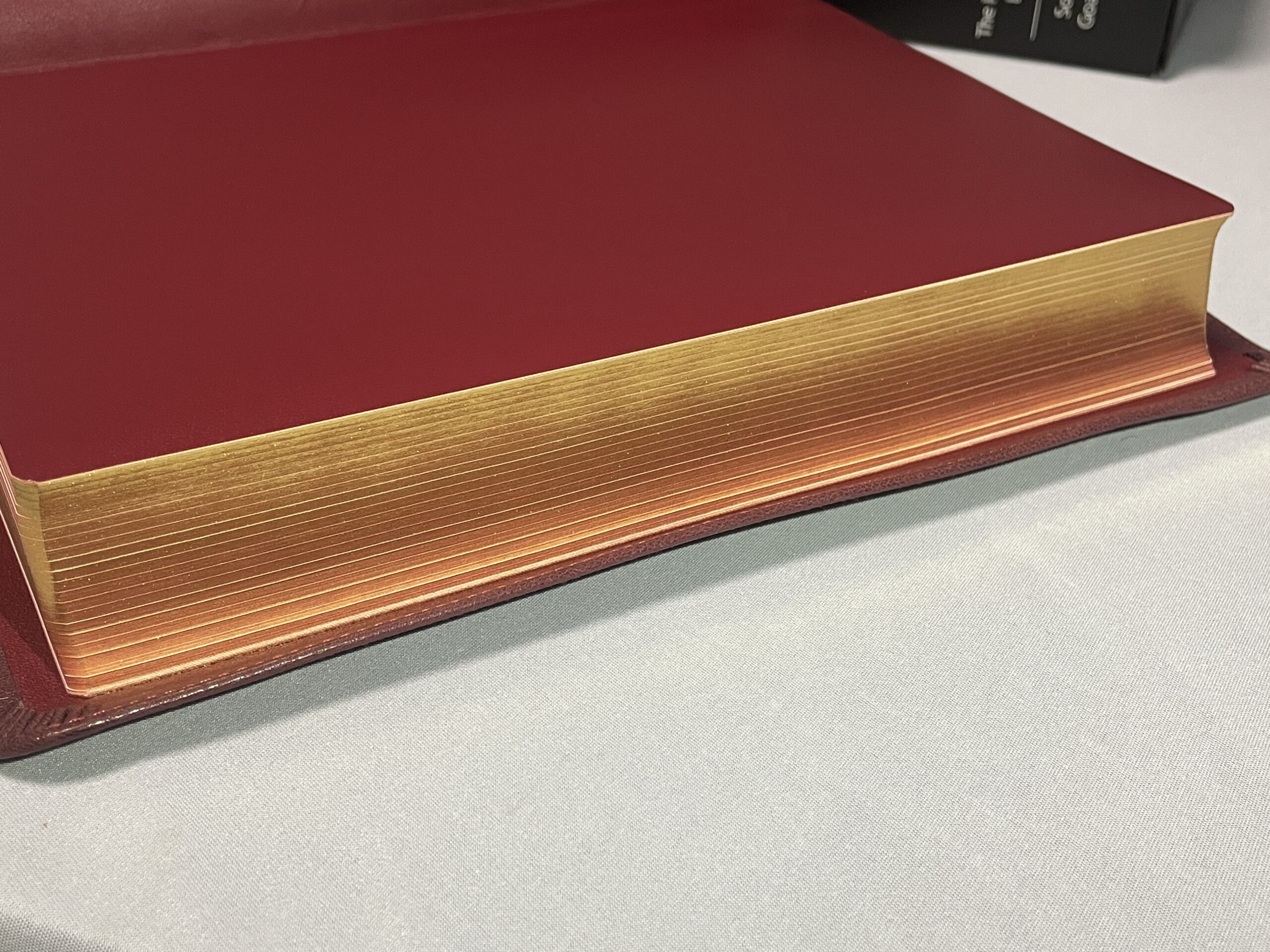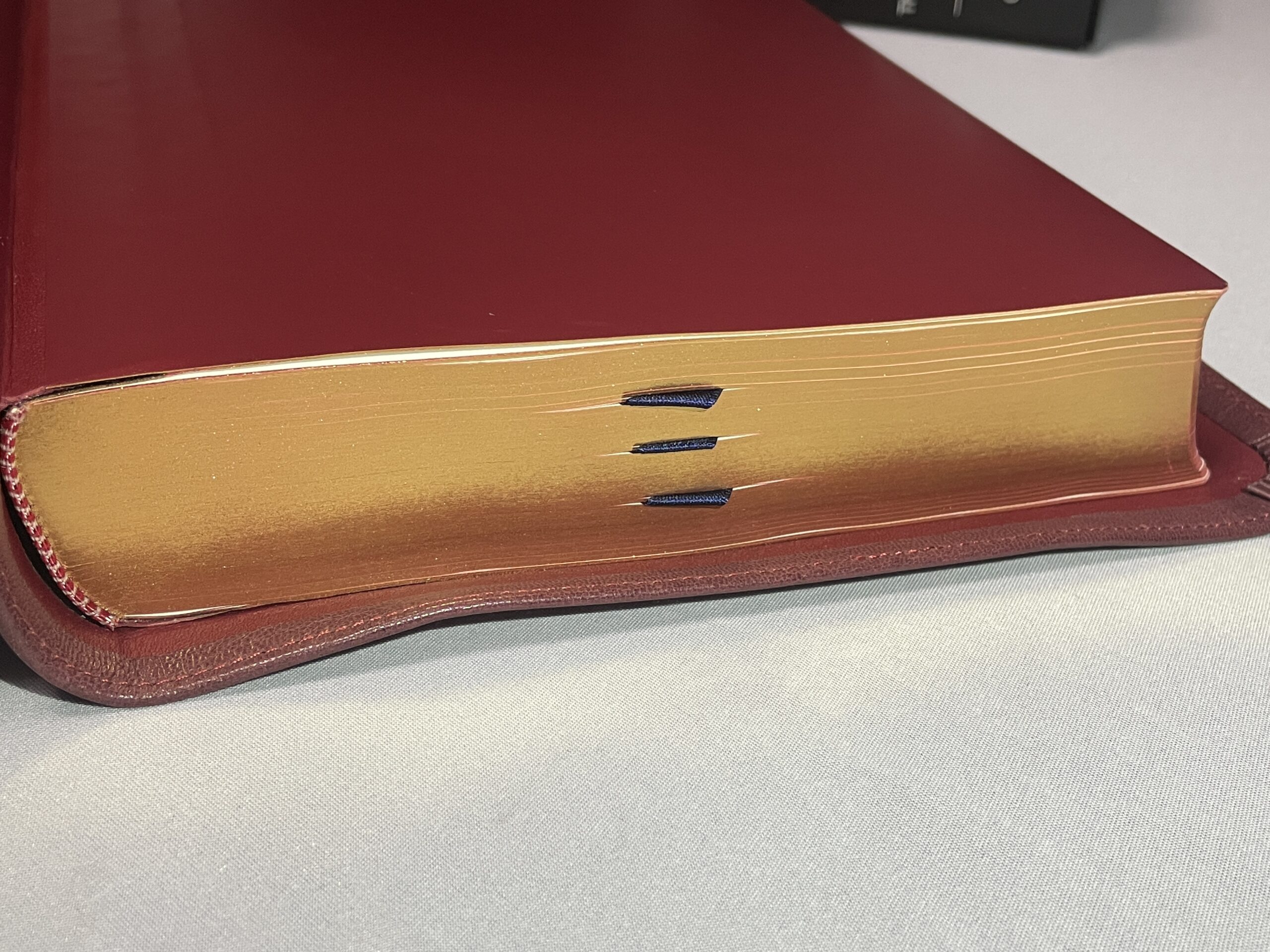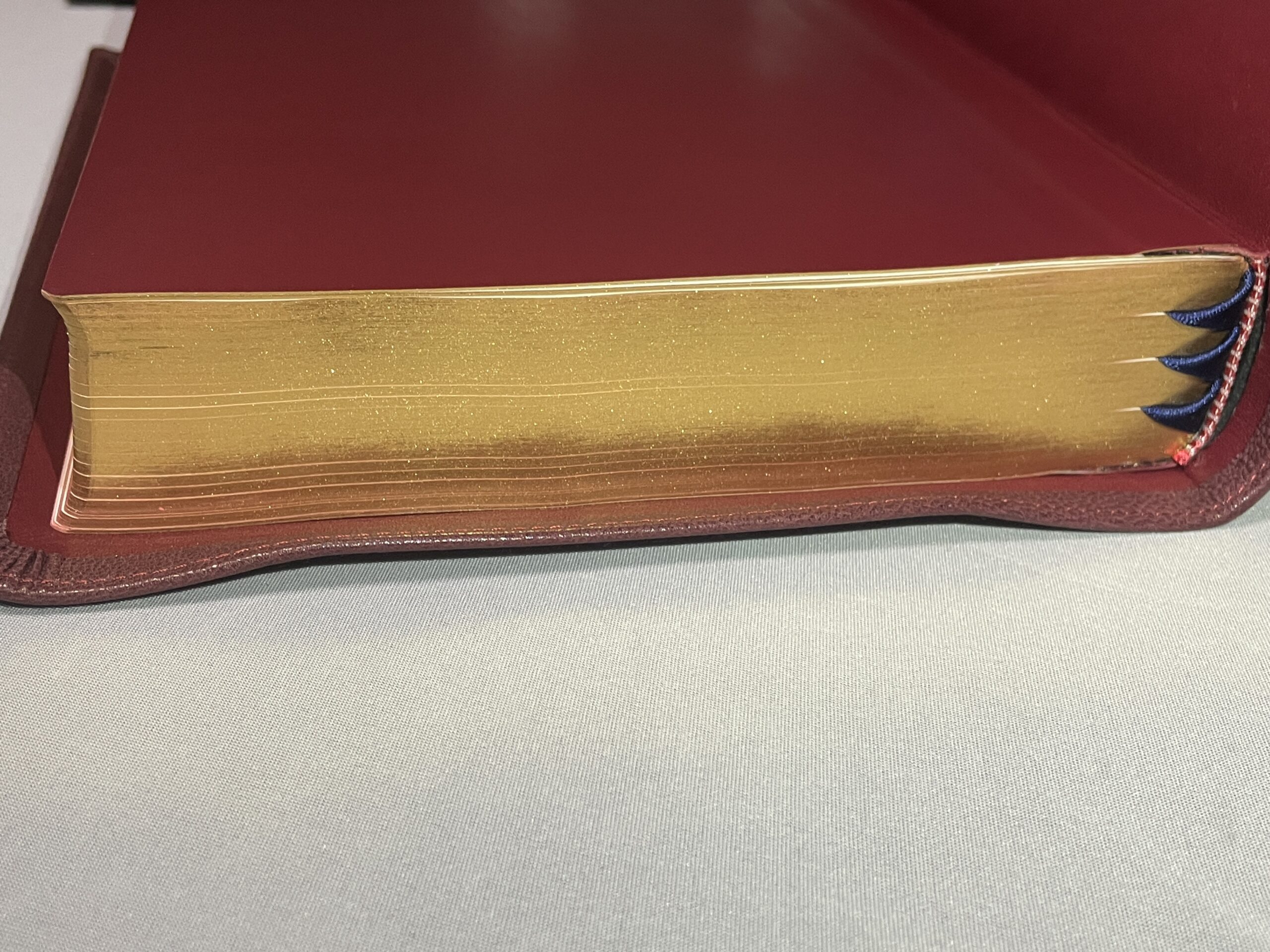 All modern, new Bibles have gilding on the page edges. Generally, this is either a red or blue color under gold or silver. Sometimes, the gold is simply a sprayed-on color also, but usually, it is a thin colored tin foil. This foil is heated and melted onto the book block. The purpose of the Preacher’s Bible is pure quality. With that in mind, we have chosen to go back to the way mid-century Bibles were made – using real gold for the gilding. The Preacher’s Bible comes with 22 karat gold leaf melted onto the edges of the pages. The gilding also helps to protect edges of the pages from damage.