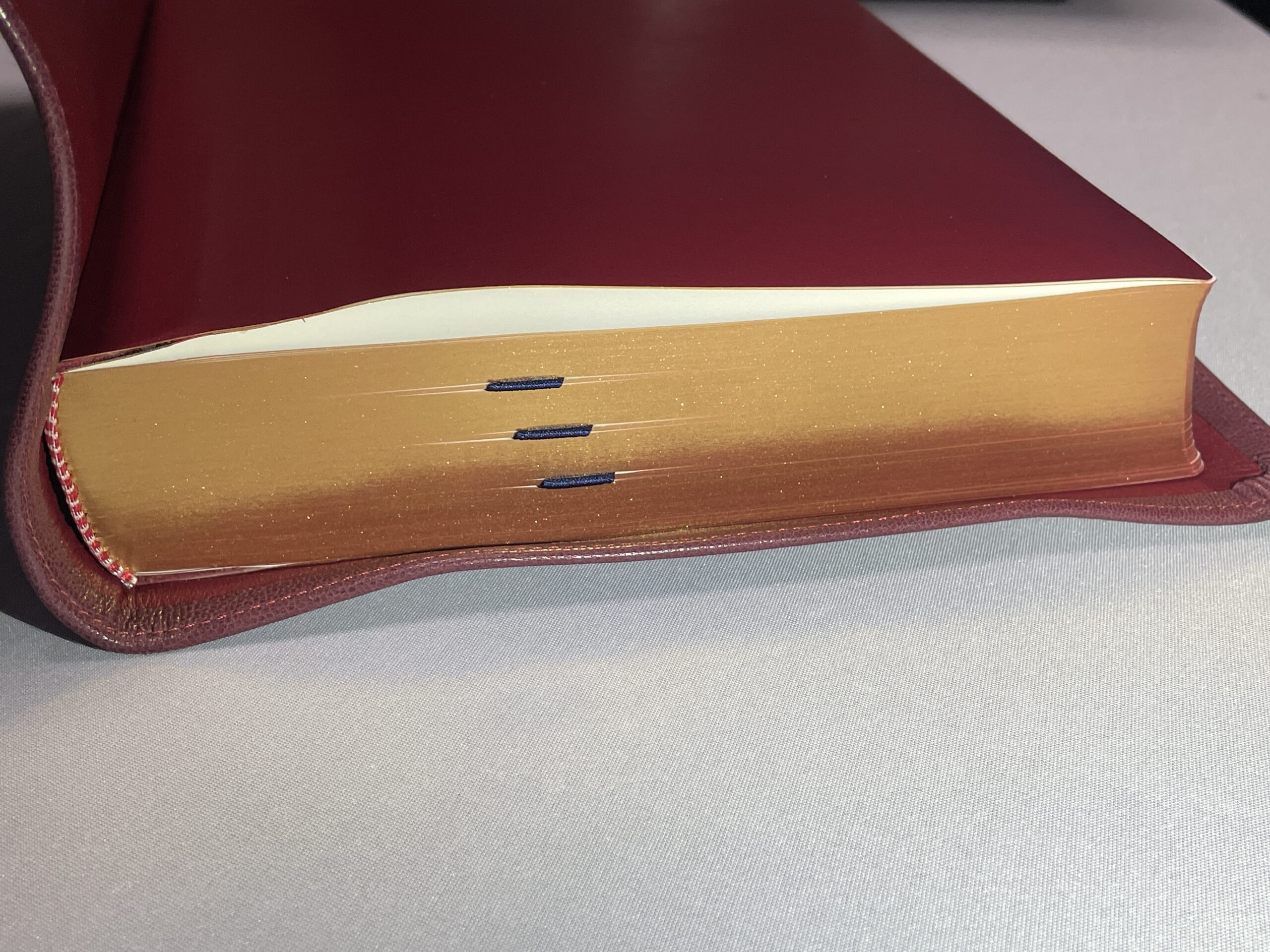 All modern, new Bibles have gilding on the page edges. Generally, this is either a red or blue color under gold or silver. Sometimes, the gold is simply a sprayed-on color also, but usually, it is a thin colored tin foil. This foil is heated and melted onto the book block. The purpose of the Preacher’s Bible is pure quality. With that in mind, we have chosen to go back to the way mid-century Bibles were made – using real gold for the gilding. The Preacher’s Bible comes with 22 karat gold leaf melted onto the edges of the pages. The gilding also helps to protect edges of the pages from damage.