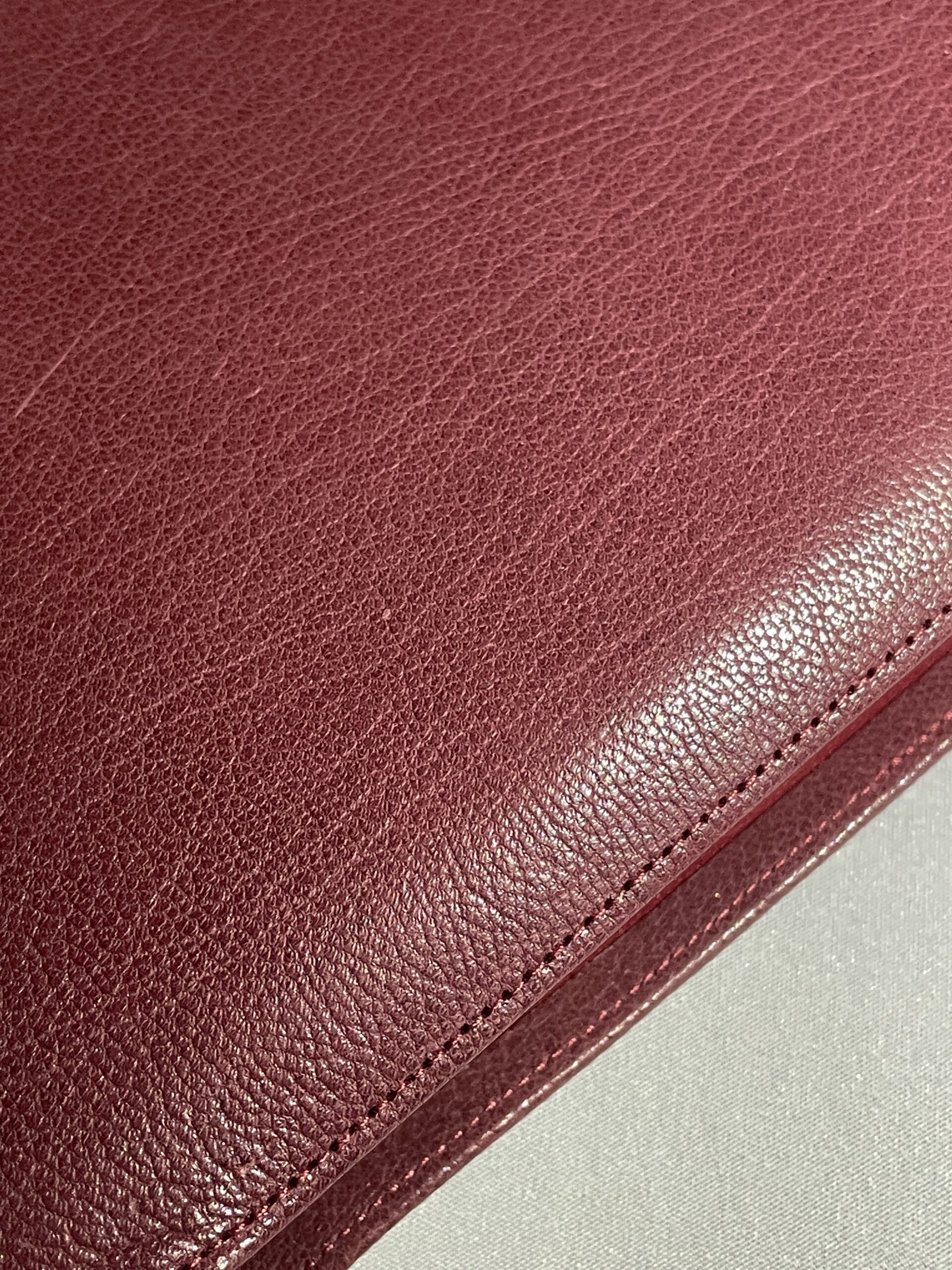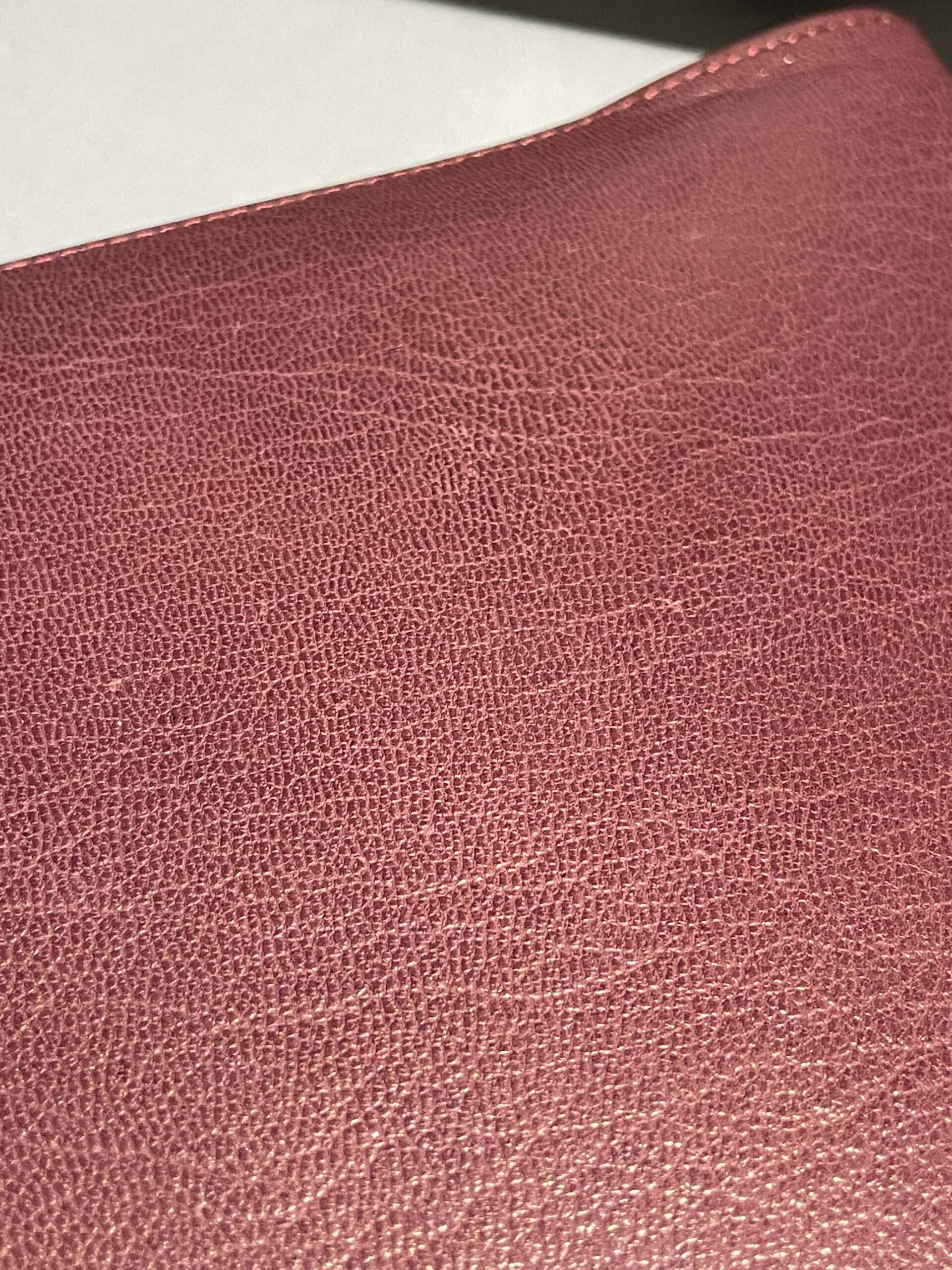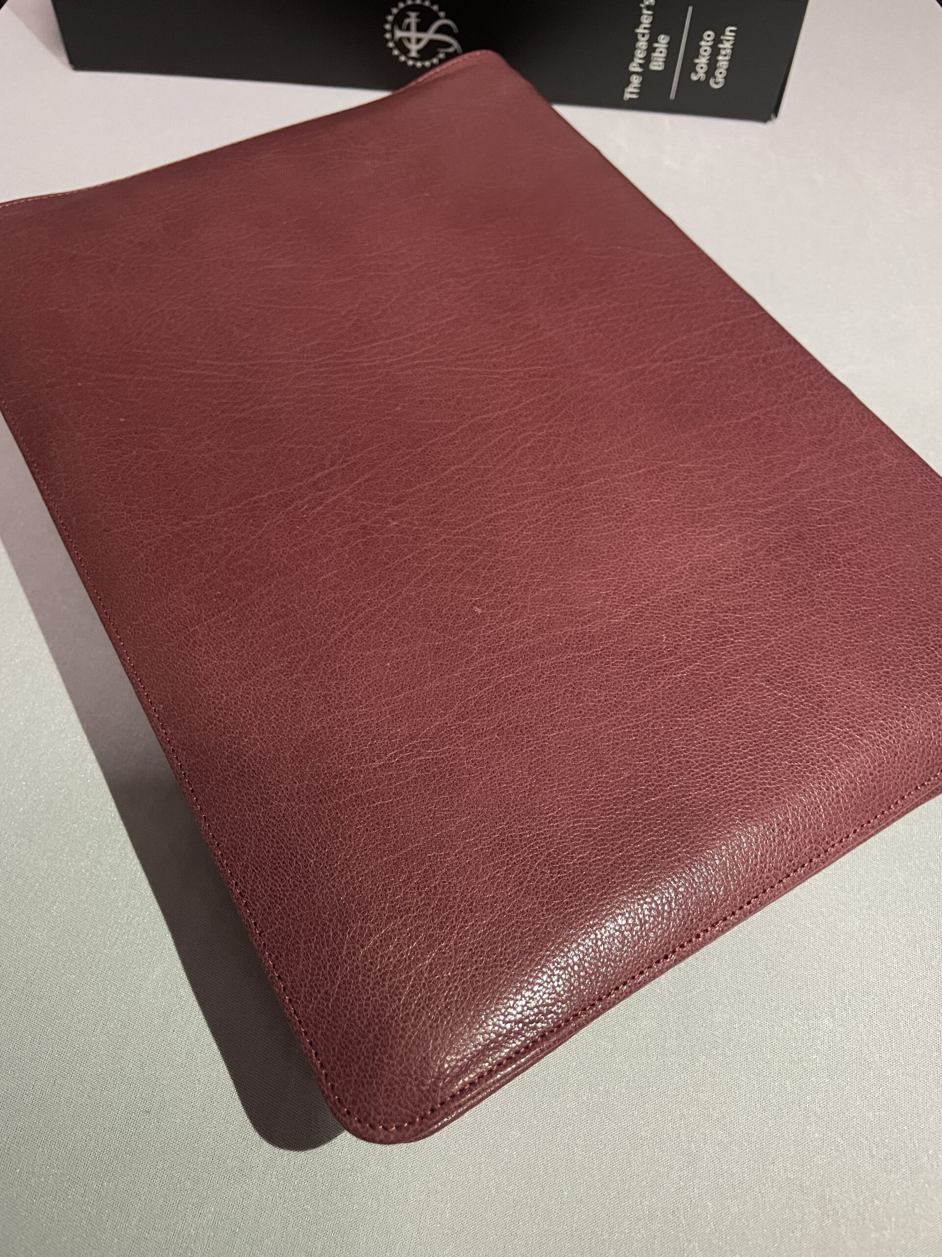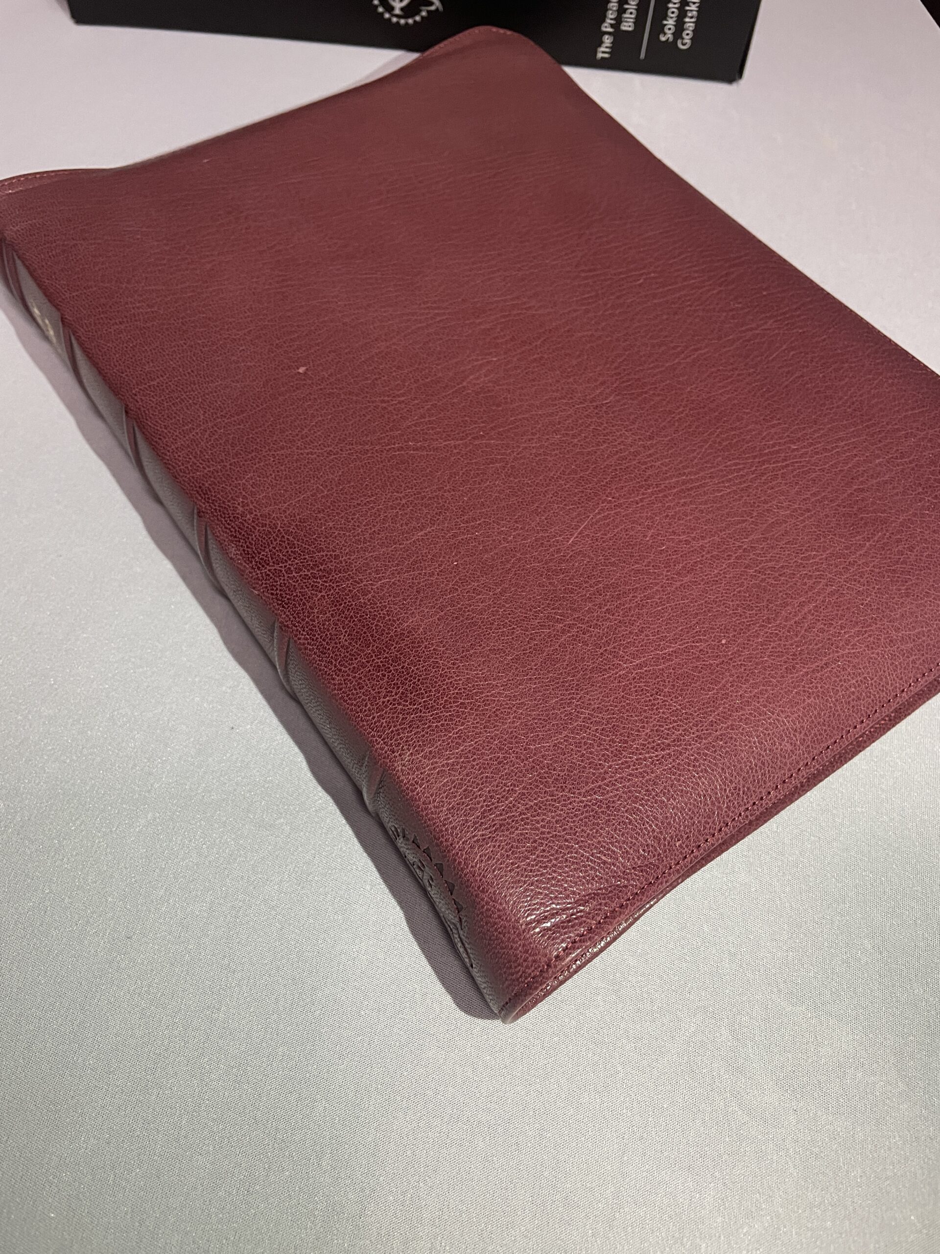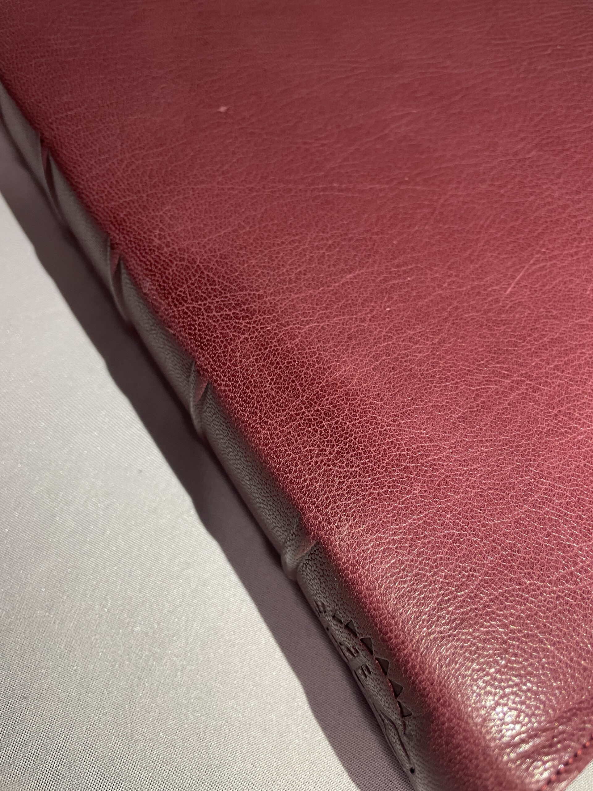 Finally, as mentioned above, this is a genuine top grain goatskin. Many other popular Bibles claim to be calfskin or even goatskin (and they are… kind of). However, what they do to keep costs down is to take the scraps of the calfskin and grind them up; they then compress these pieces together with an adhesive and emboss a grain on the top (similar to OSB boards or plywood).