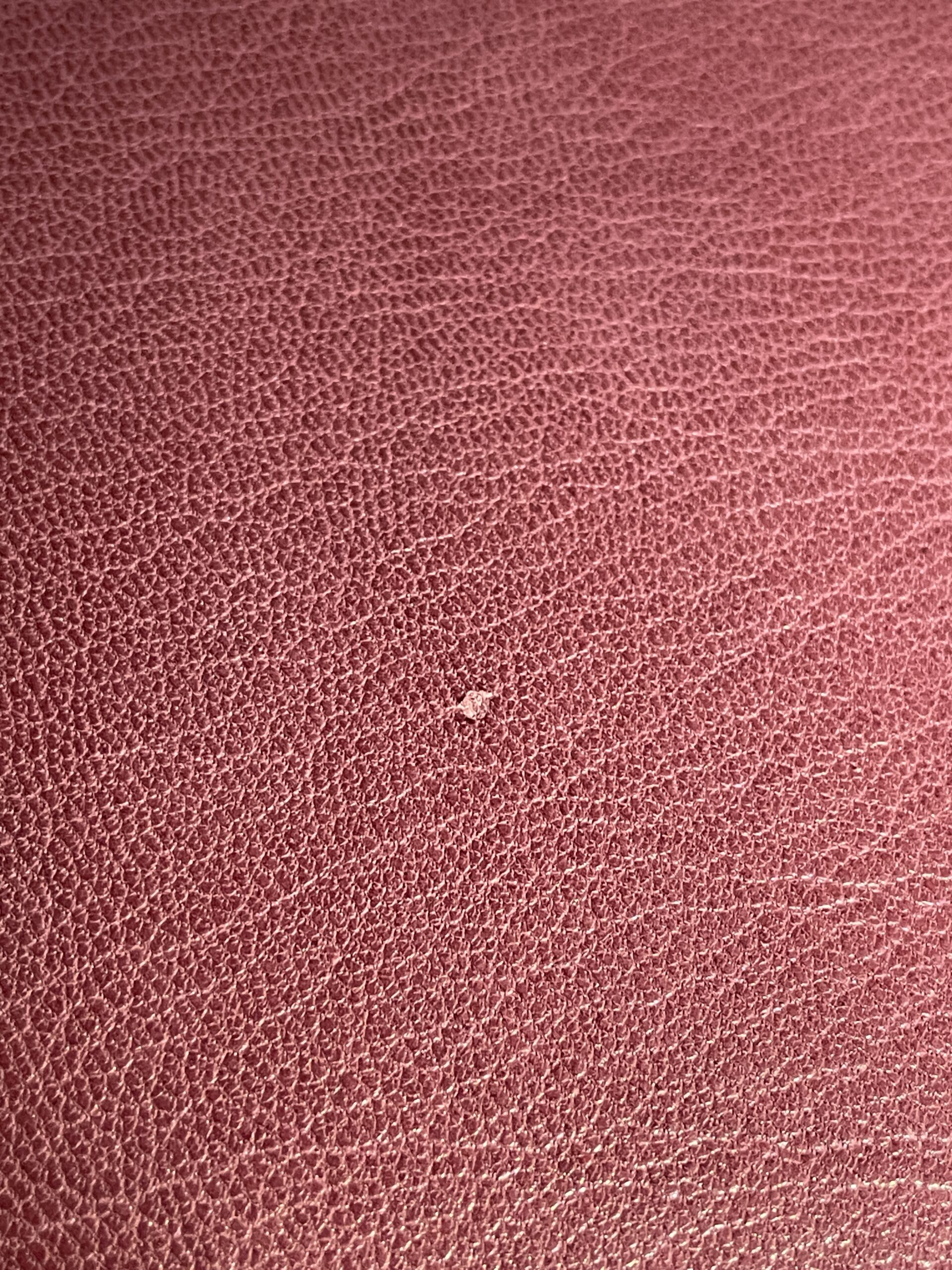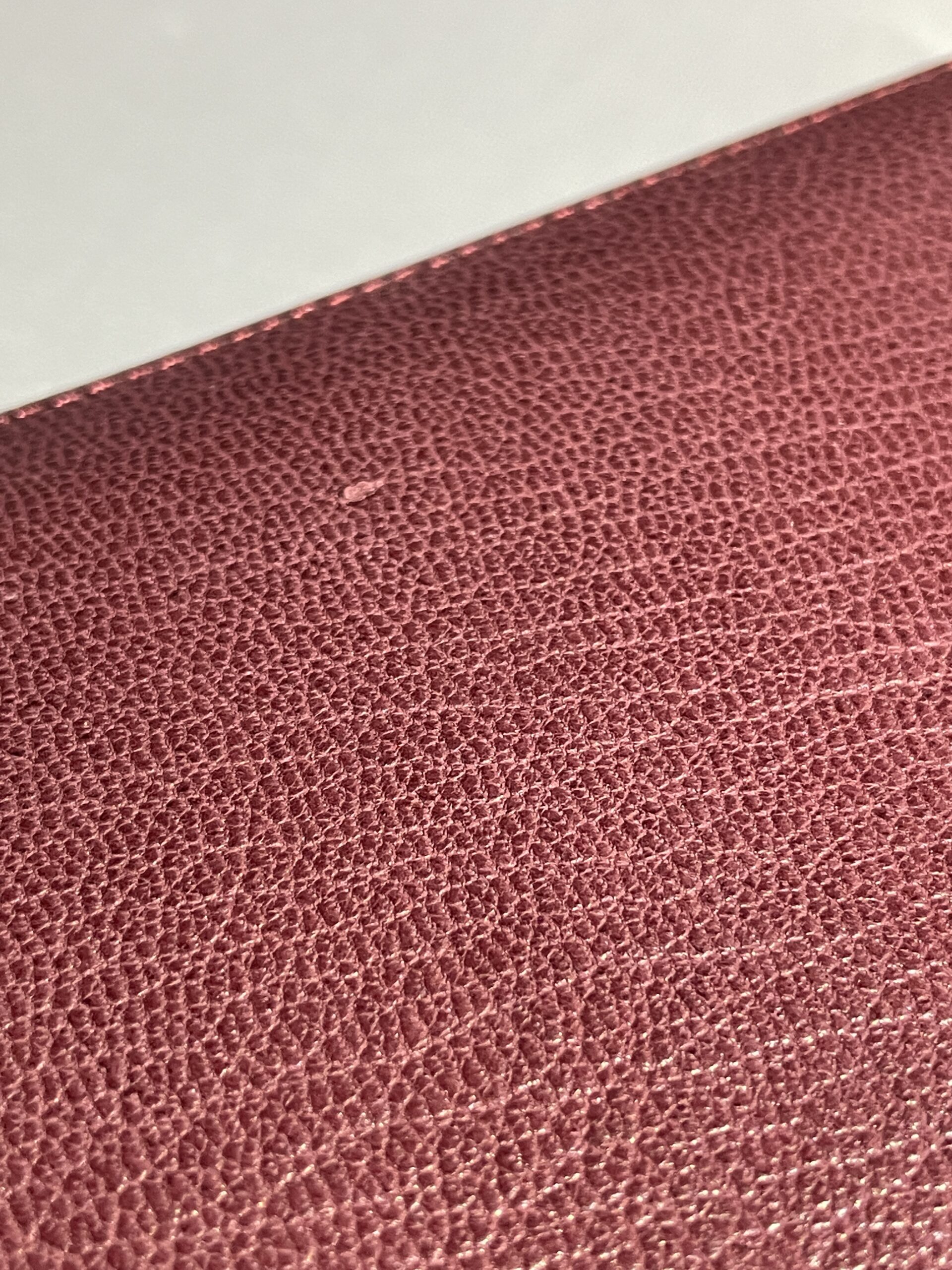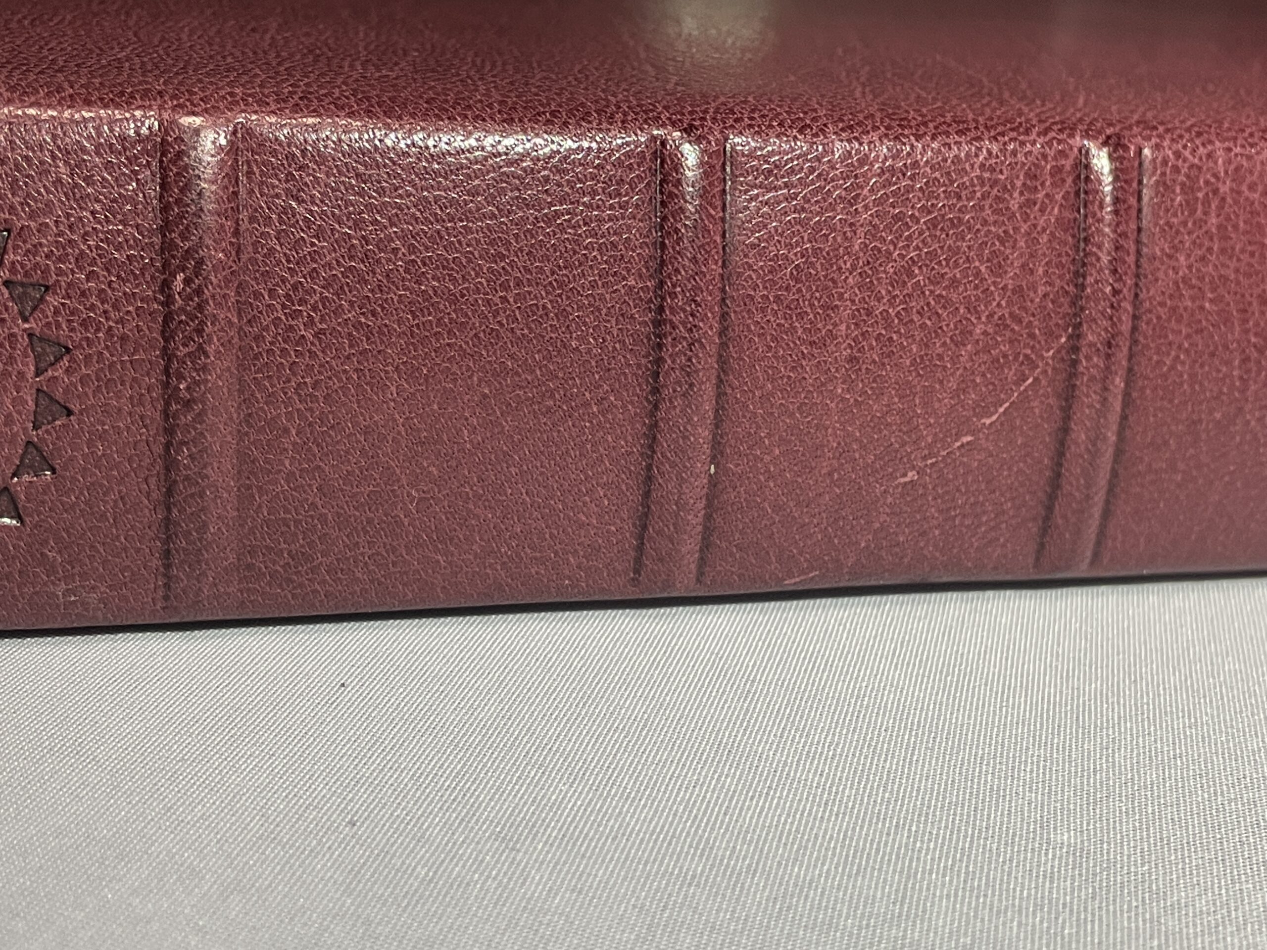 This Bible was one of a number of Bibles that was dislodged when shipping from Europe. As a result, it has six scuffs to the gold gilding which led us to consider it to be a seconds copy. There is also several blemishes in the leather grain on both sides – please see photos. It is marked SEC to notate its seconds copy status.