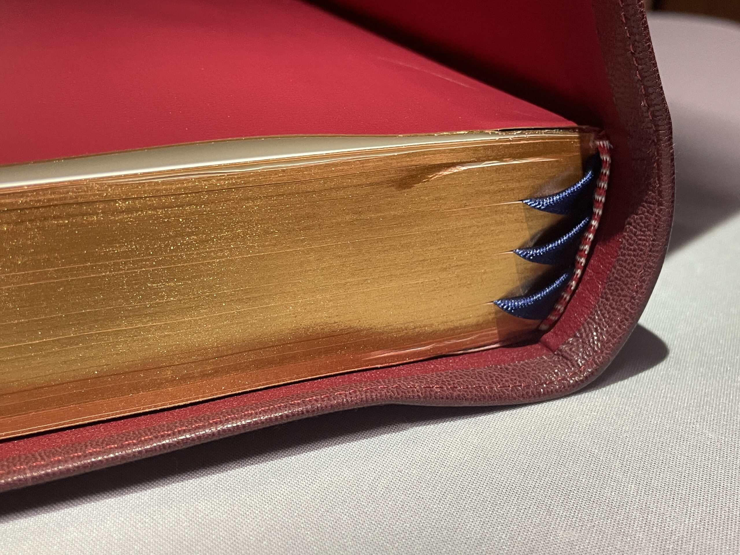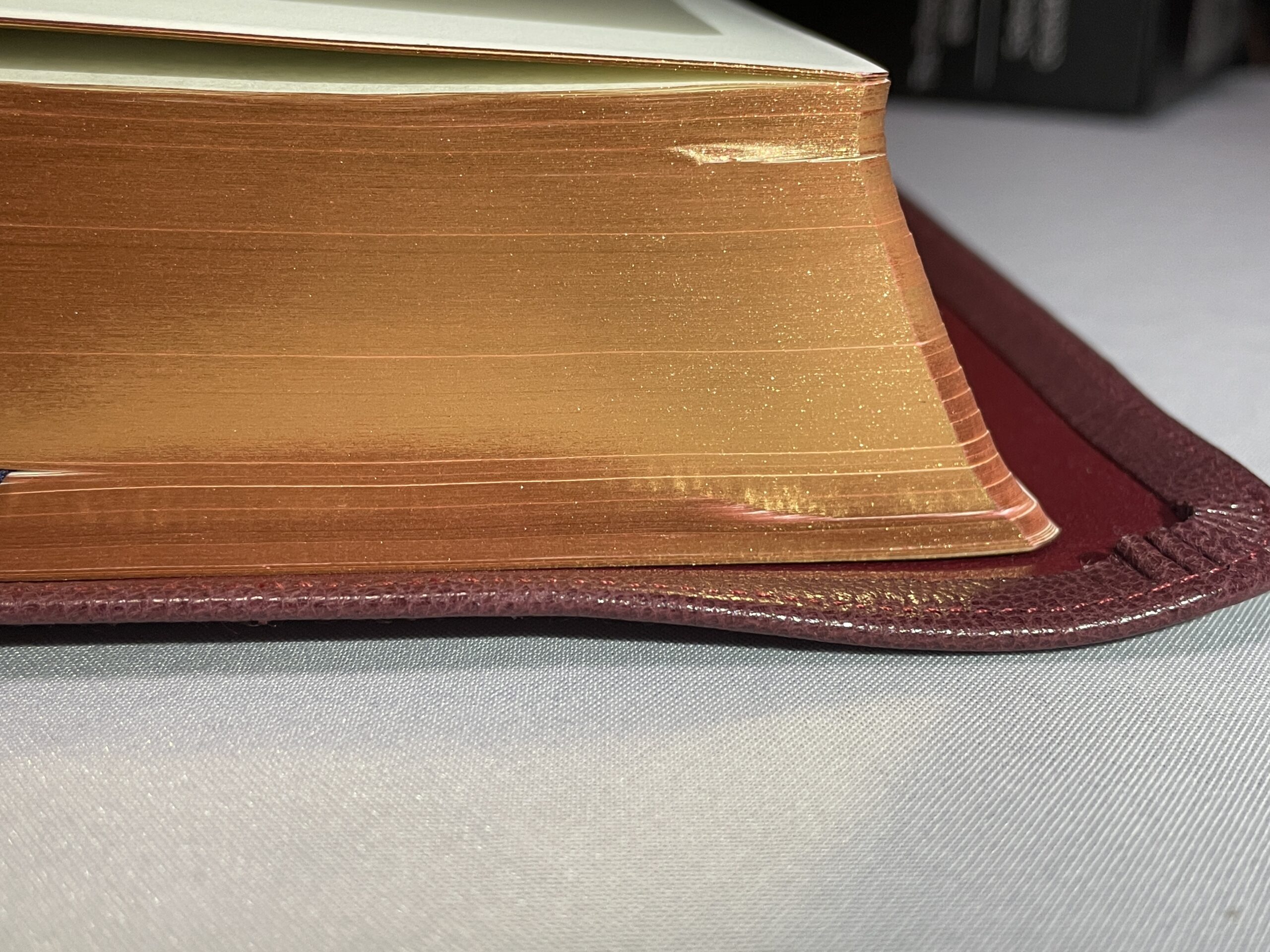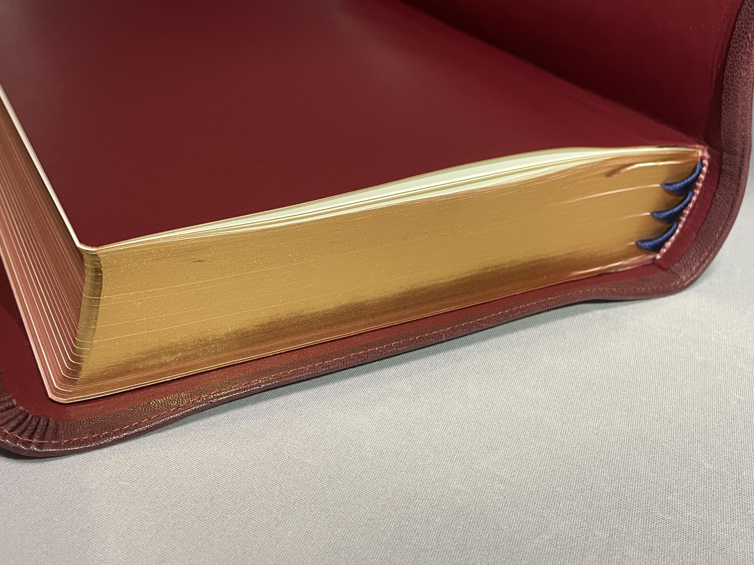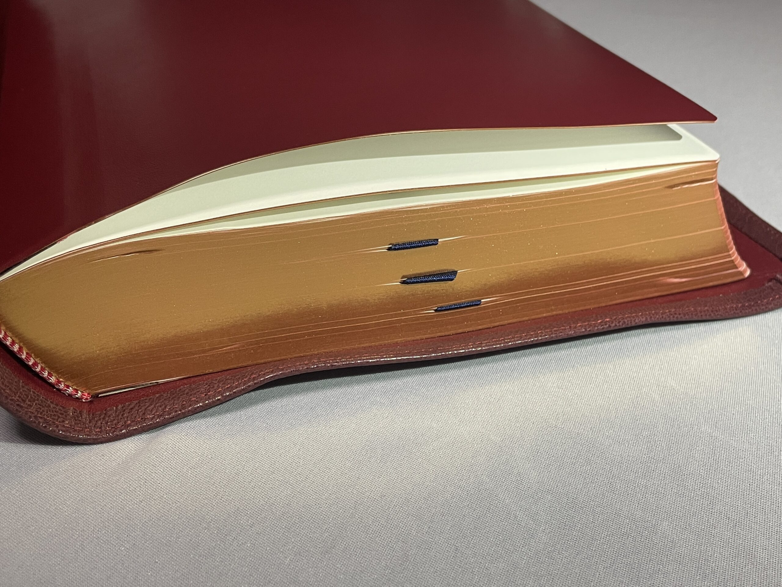 All modern, new Bibles have gilding on the page edges. Generally, this is either a red or blue color under gold or silver. Sometimes, the gold is simply a sprayed-on color also, but usually, it is a thin colored tin foil. This foil is heated and melted onto the book block. The purpose of the Preacher’s Bible is pure quality. With that in mind, we have chosen to go back to the way mid-century Bibles were made – using real gold for the gilding. The Preacher’s Bible comes with 22 karat gold leaf melted onto the edges of the pages. The gilding also helps to protect edges of the pages from damage.