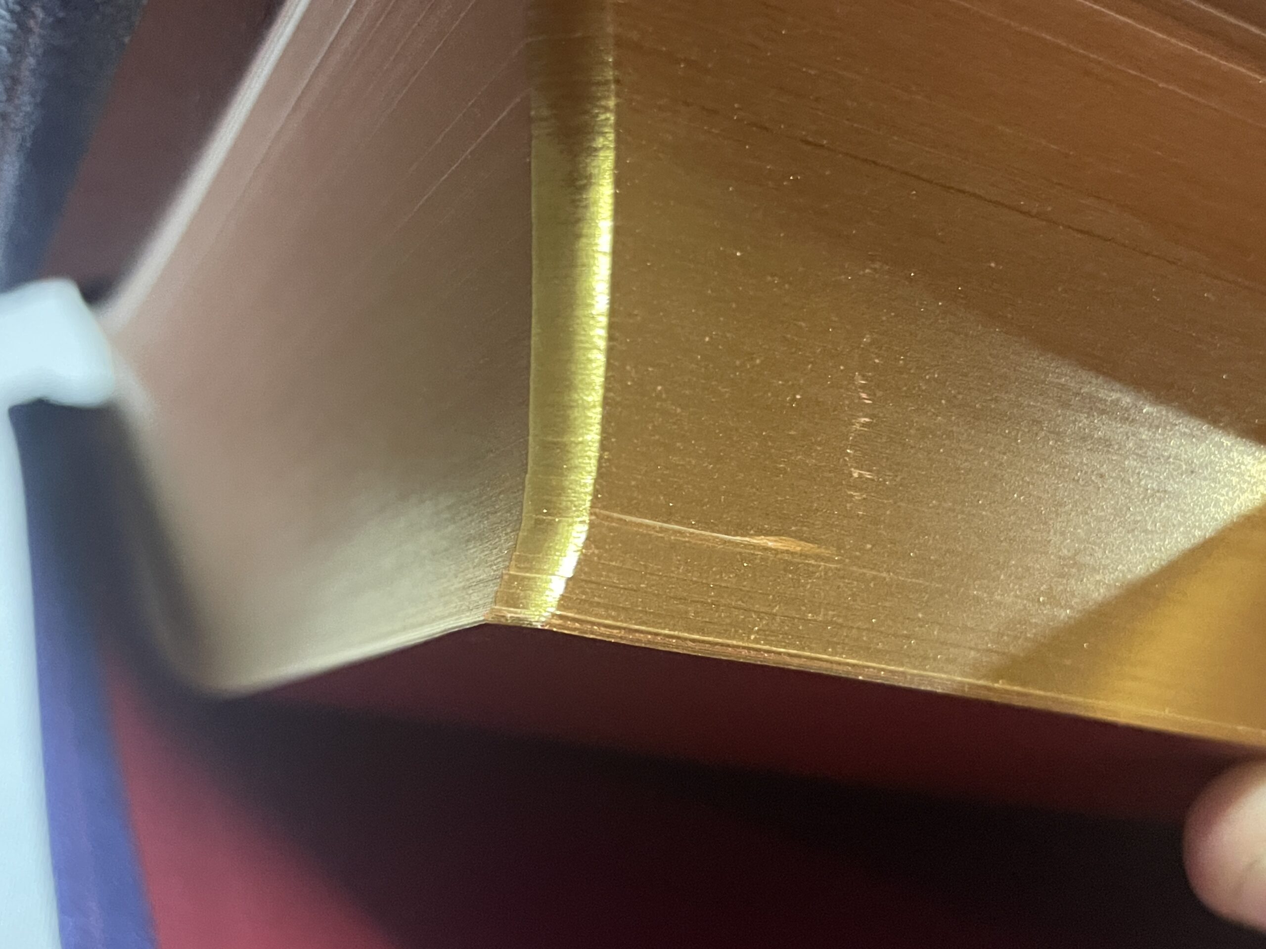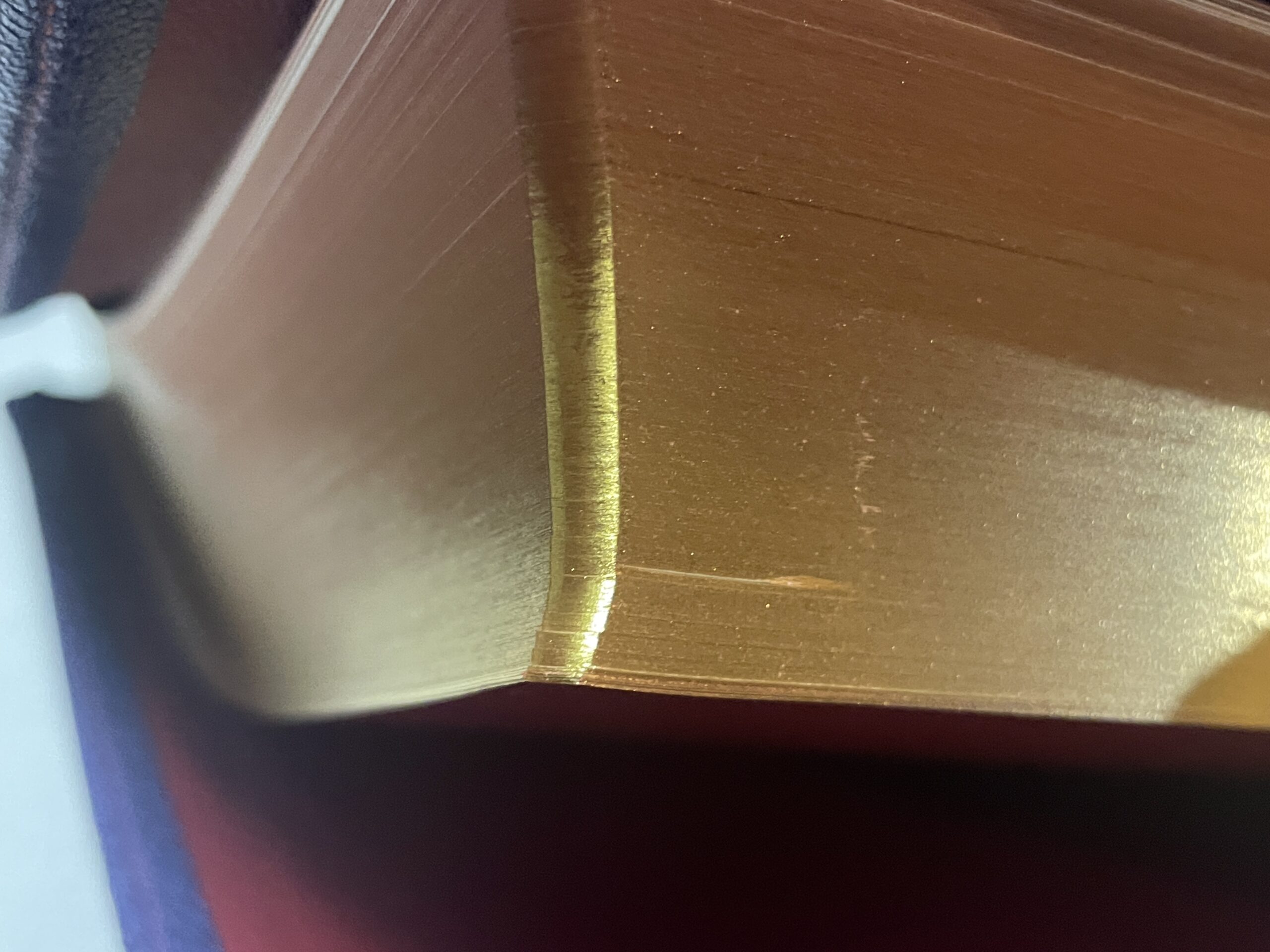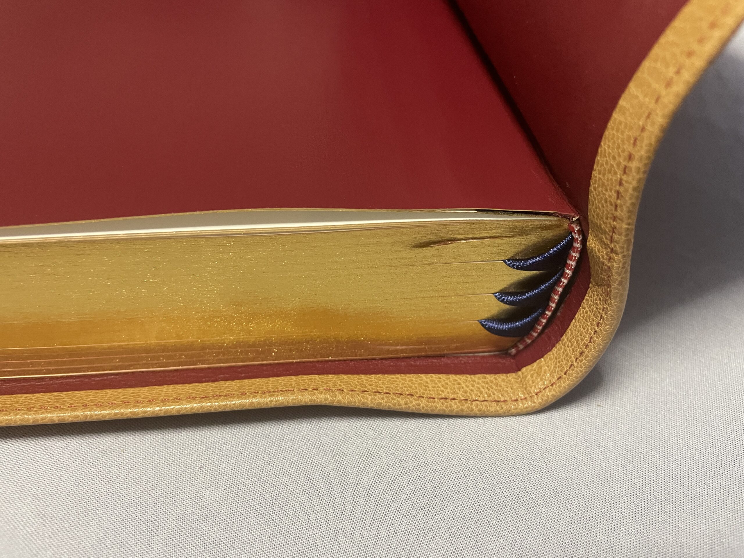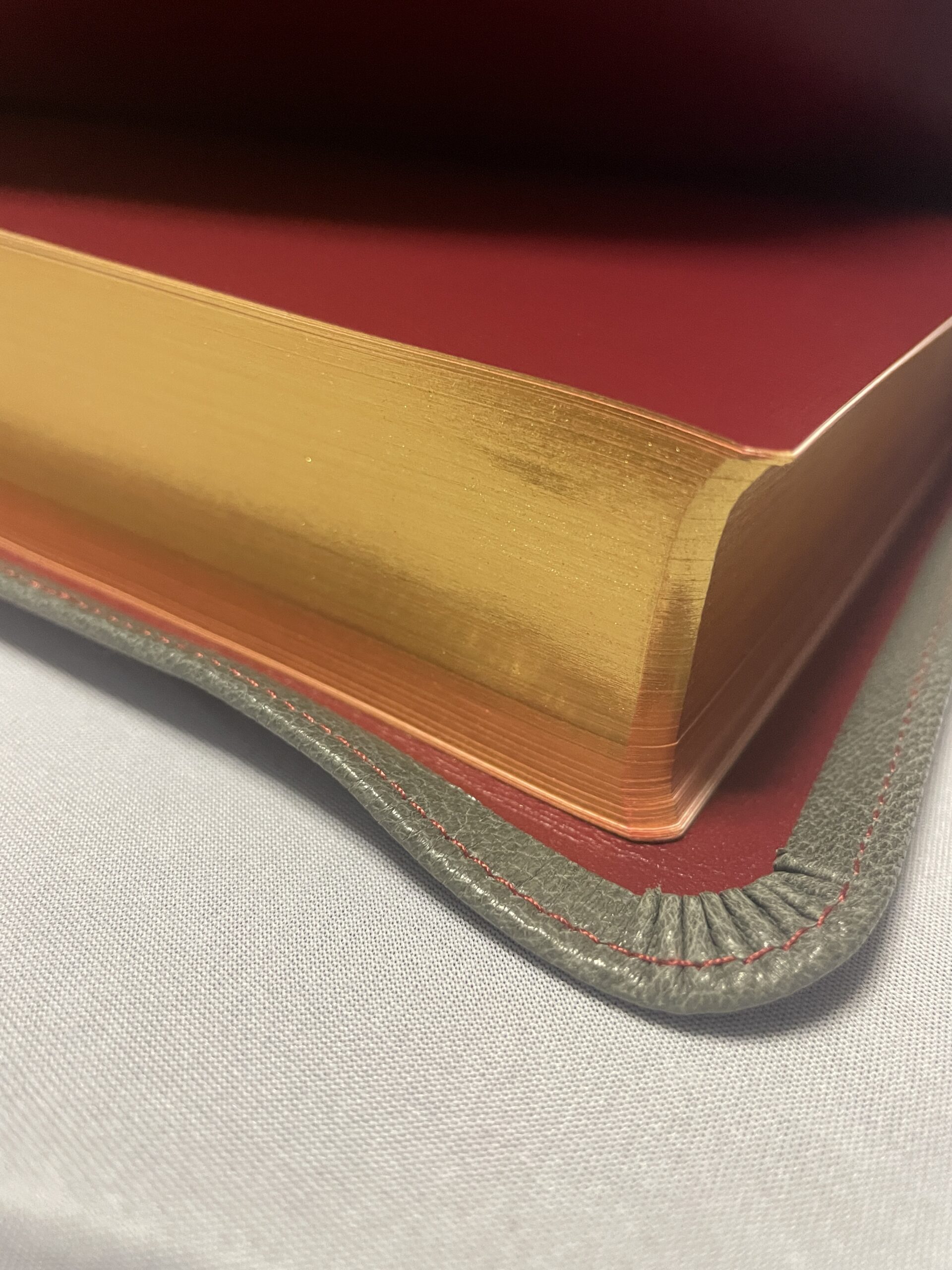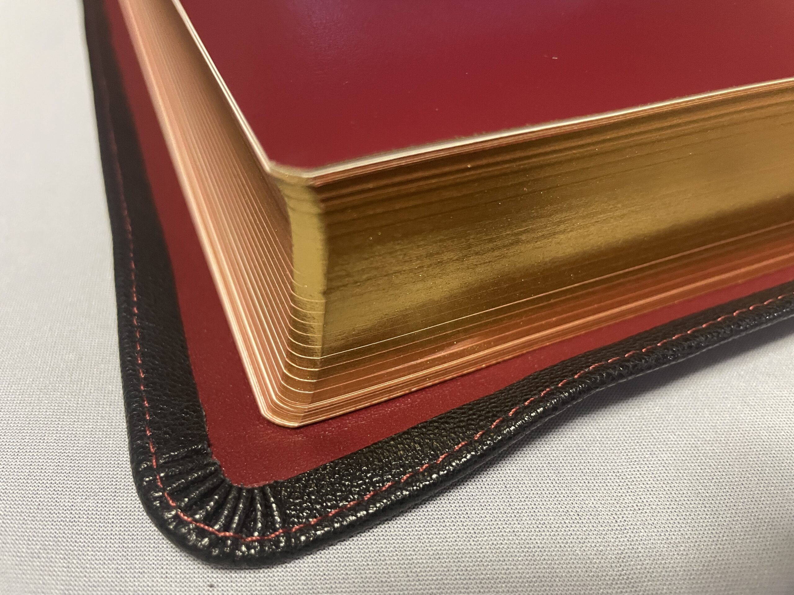 All modern, new Bibles have gilding on the page edges. Generally, this is either a red or blue color under gold or silver. Sometimes, the gold is simply a sprayed-on color also, but usually, it is a thin colored tin foil. This foil is heated and melted onto the book block. The purpose of the Preacher’s Bible is pure quality. With that in mind, we have chosen to go back to the way mid-century Bibles were made – using real gold for the gilding. The Preacher’s Bible comes with 22 karat gold leaf melted onto the edges of the pages. The gilding also helps to protect edges of the pages from damage.