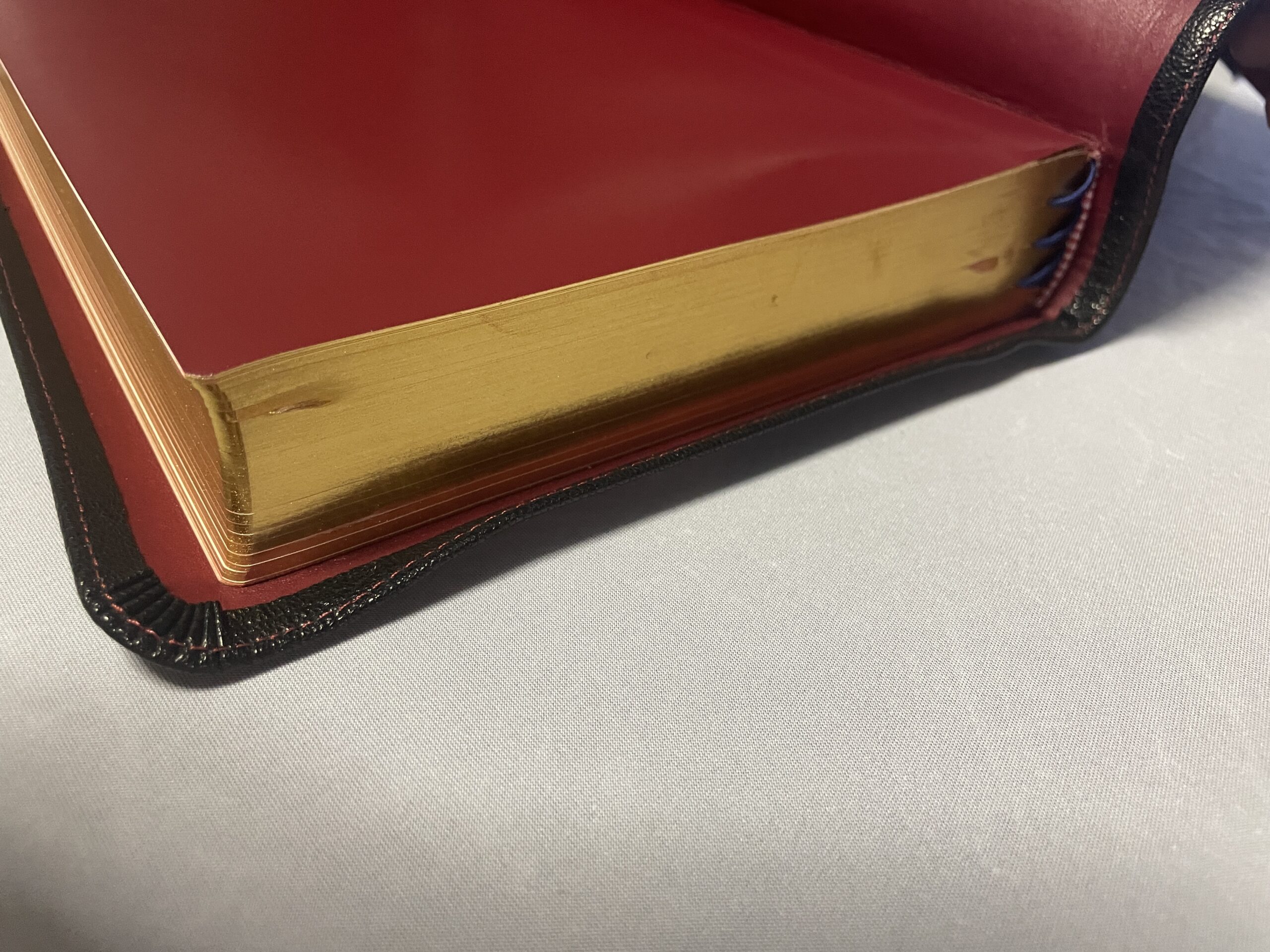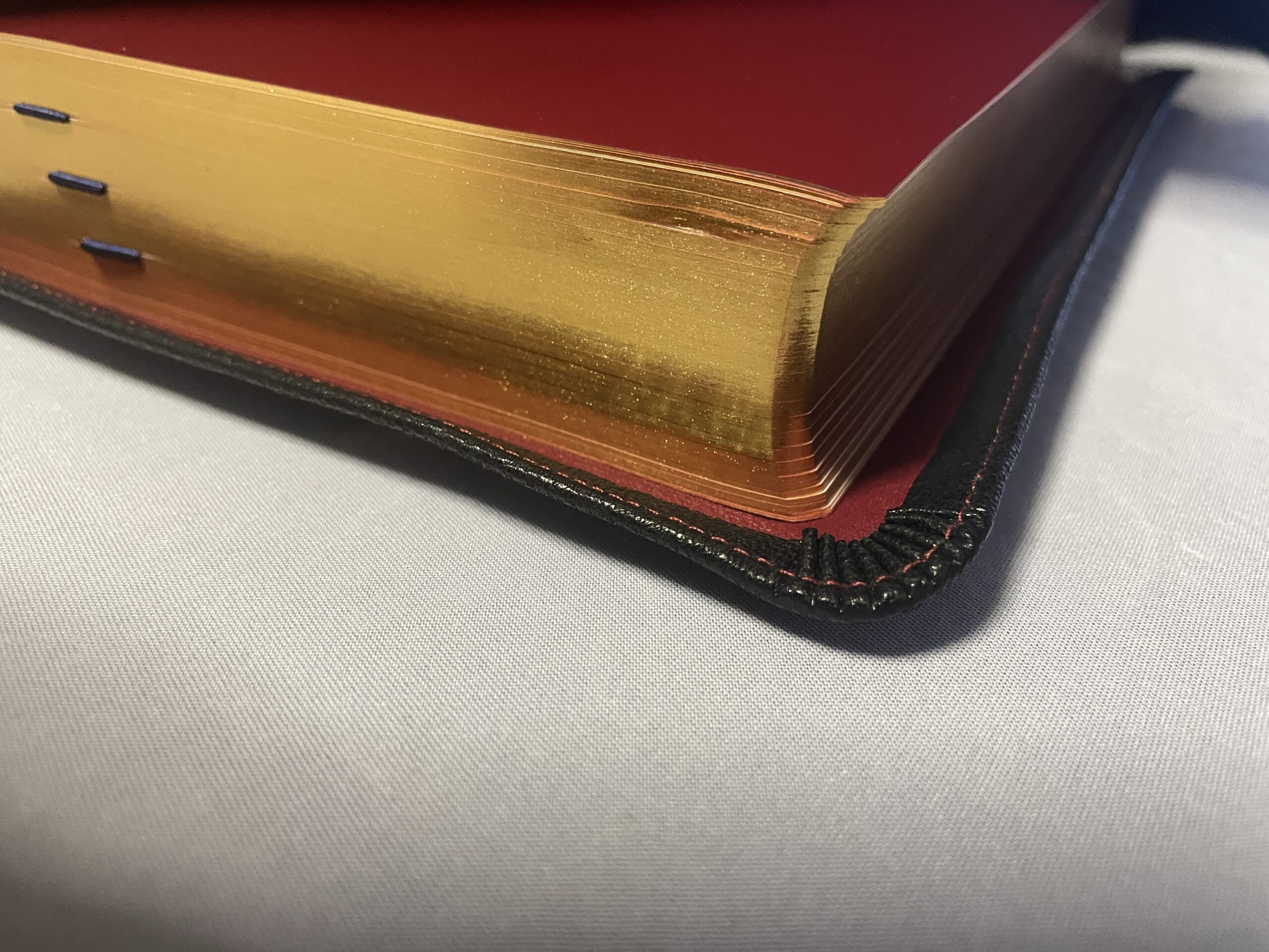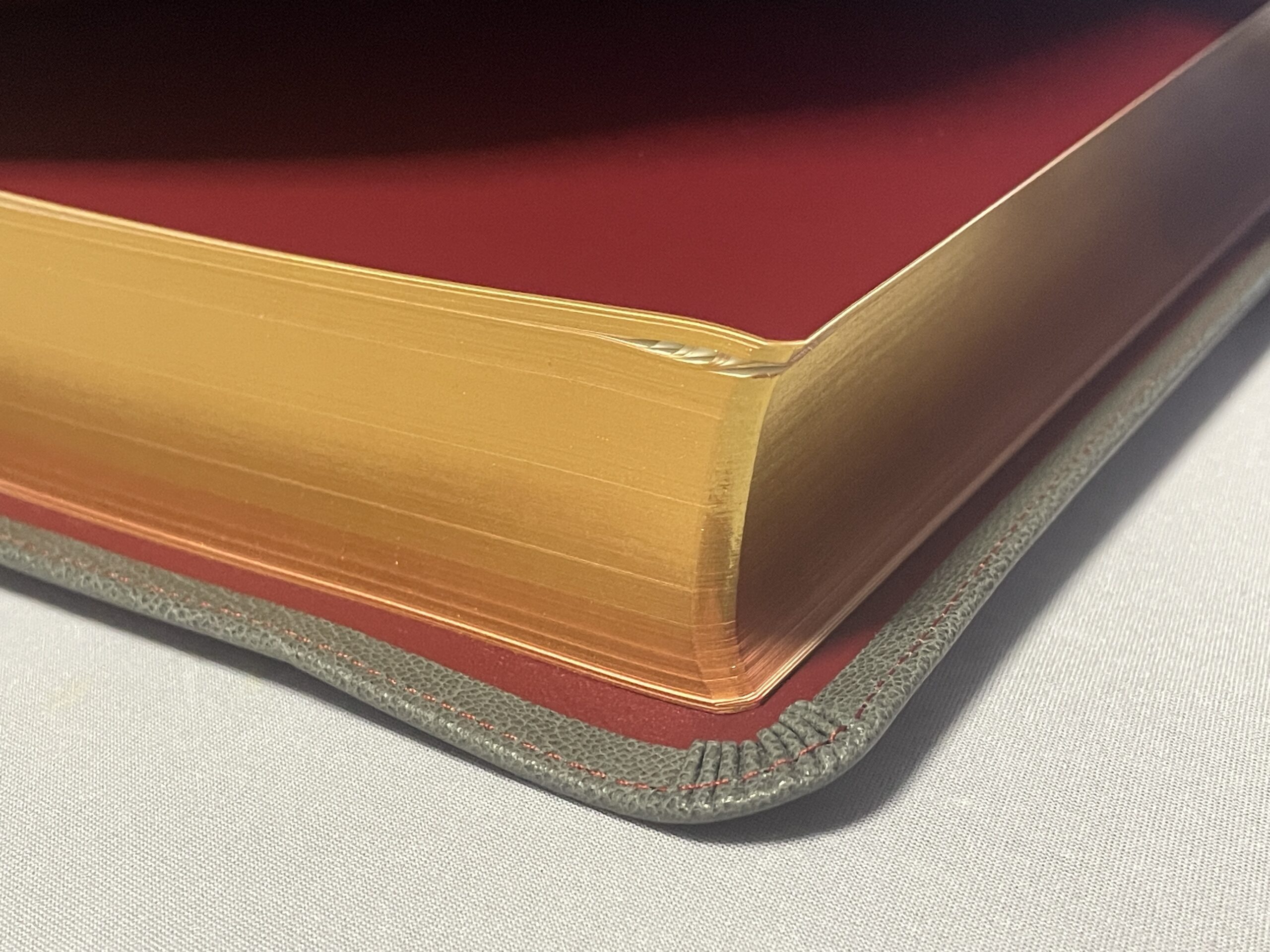 All modern, new Bibles have gilding on the page edges. Generally, this is either a red or blue color under gold or silver. Sometimes, the gold is simply a sprayed-on color also, but usually, it is a thin colored tin foil. This foil is heated and melted onto the book block. The purpose of the Preacher’s Bible is pure quality. With that in mind, we have chosen to go back to the way mid-century Bibles were made – using real gold for the gilding. The Preacher’s Bible comes with 22 karat gold leaf melted onto the edges of the pages. The gilding also helps to protect edges of the pages from damage.