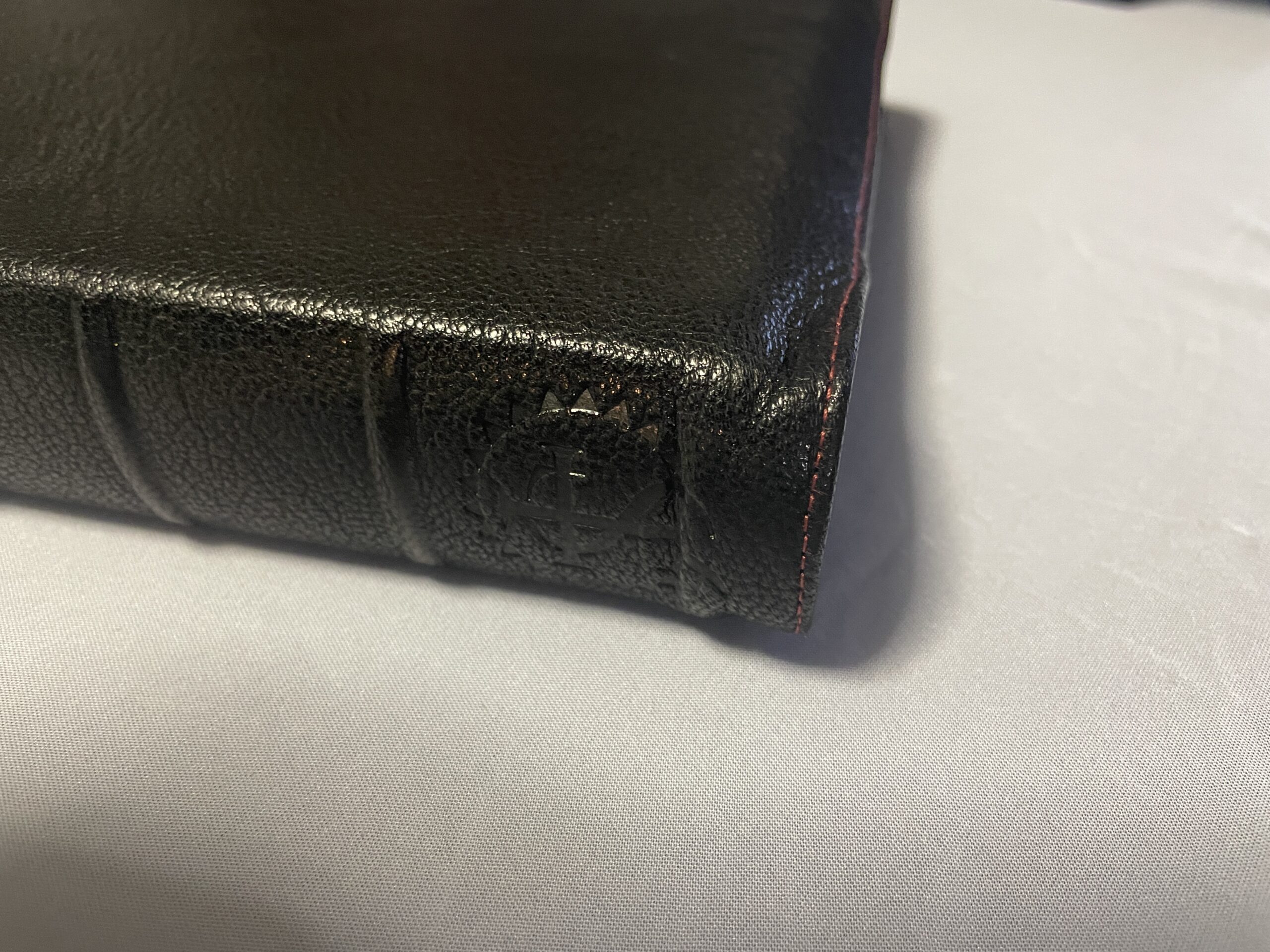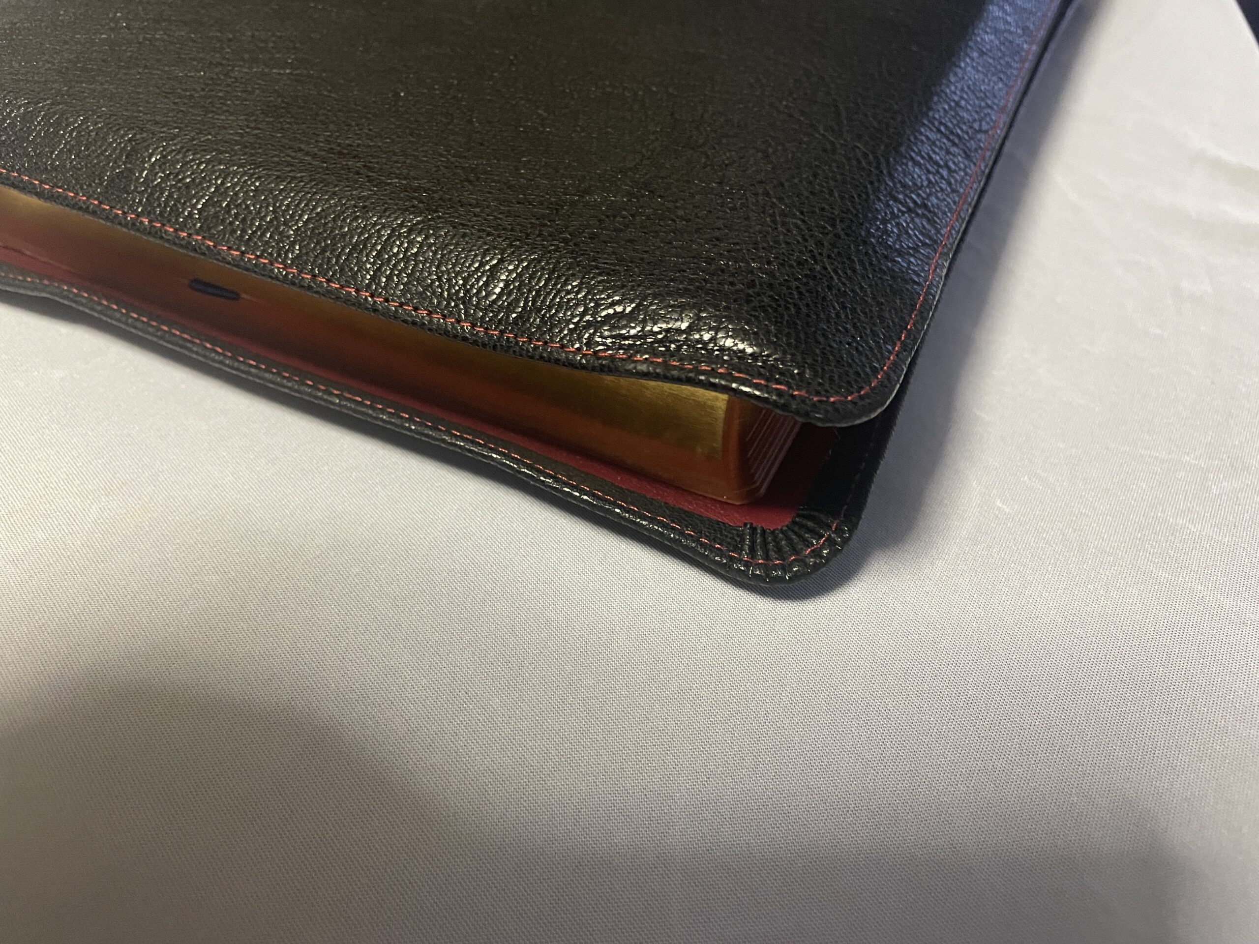 Finally, as mentioned above, this is a genuine top grain goatskin. Many other popular Bibles claim to be calfskin or even goatskin (and they are… kind of). However, what they do to keep costs down is to take the scraps of the calfskin and grind them up; they then compress these pieces together with an adhesive and emboss a grain on the top (similar to OSB boards or plywood).